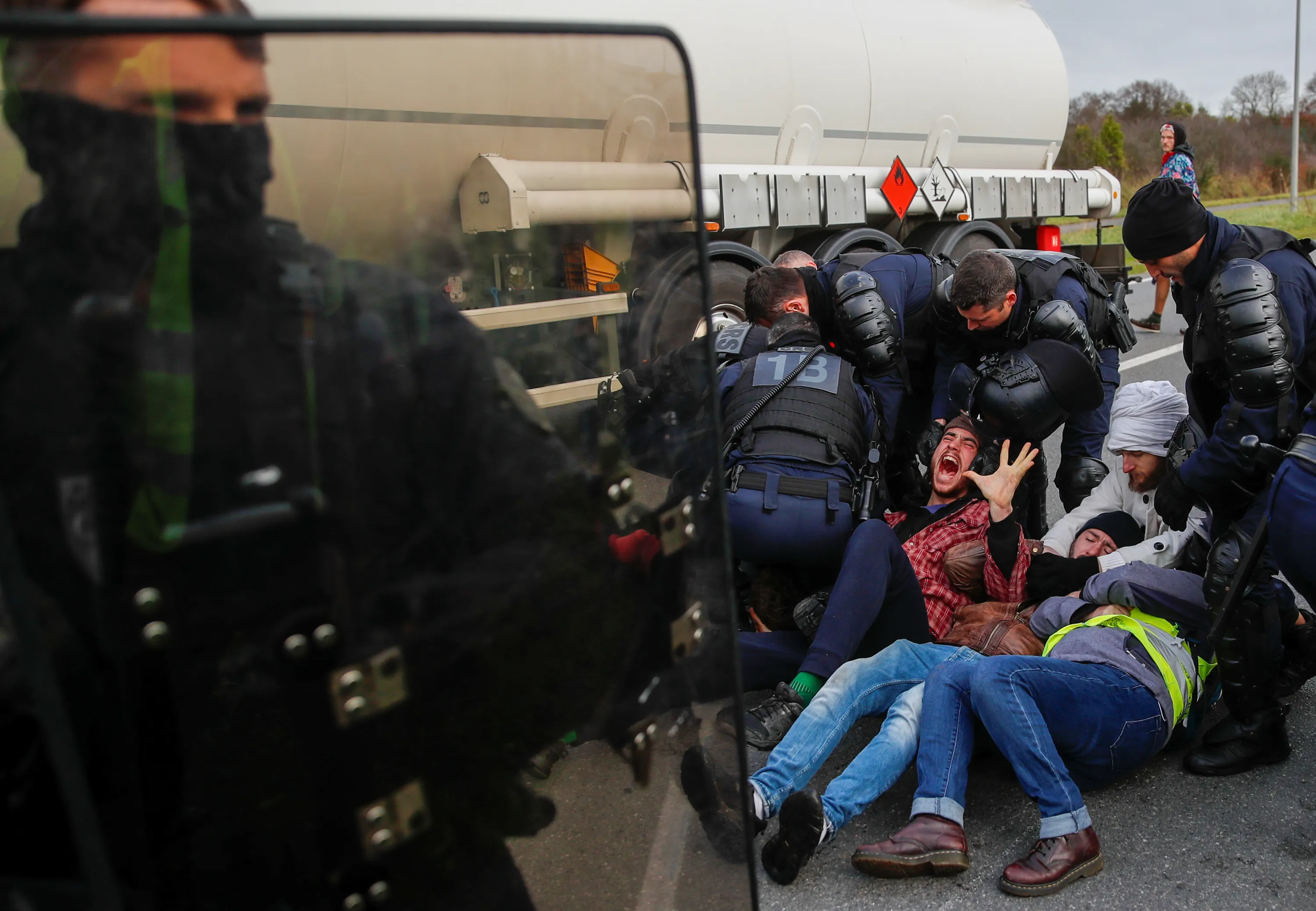 French gendarmes evacuate demonstrators who sit on the road and block full tanker trucks in front of the French oil giant Total refinery in Donges, France, January 2, 2020. (Photo by Stephane Mahe/Reuters)