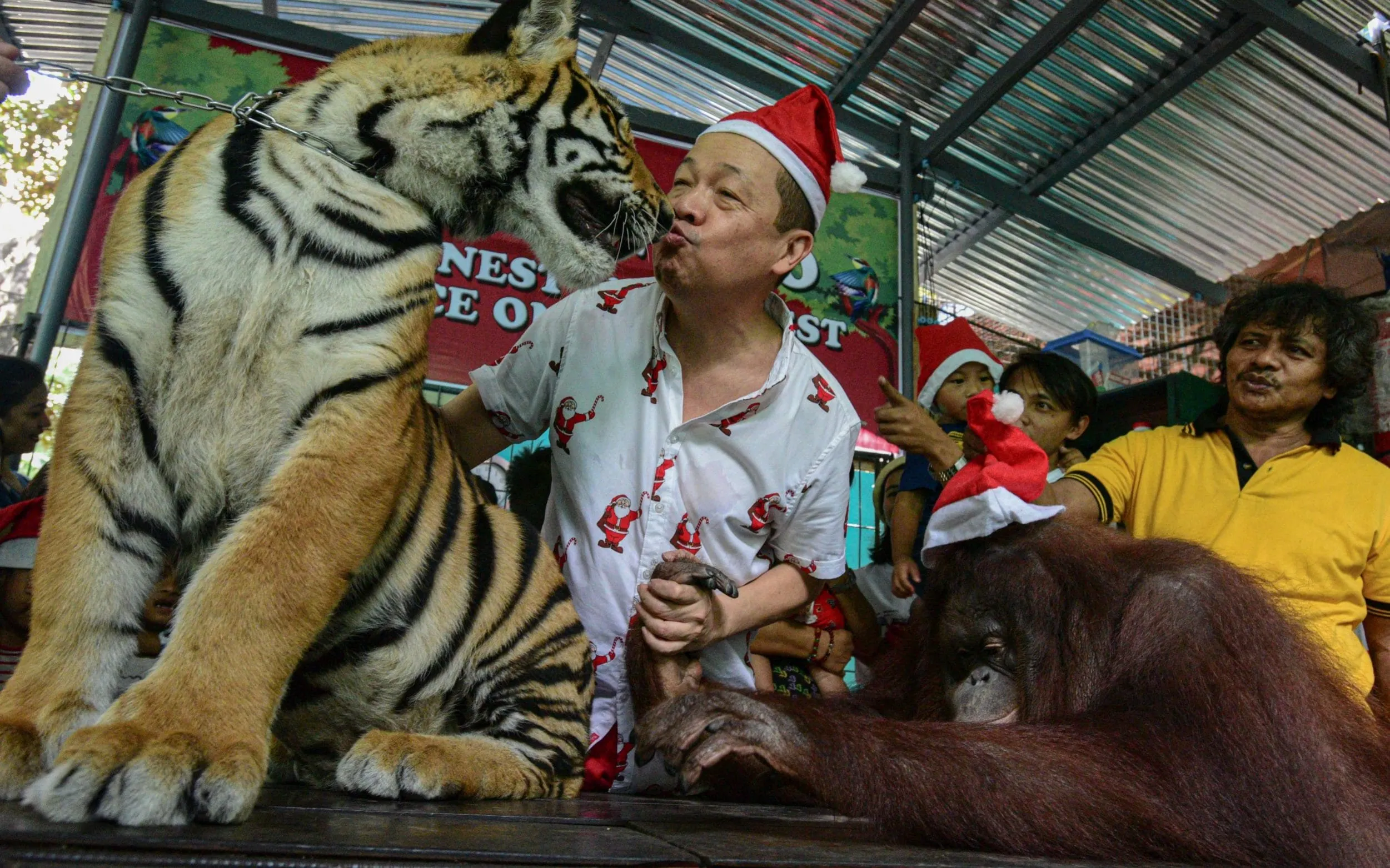 Manny Tangco, owner of the Malabon Zoo, kisses Rody the tiger as Marimar the orangutan looks on during the “Animal Christmas Party”, where children were treated to a tour of the Malabon Zoo, in Manila on December 21, 2019. (Photo by Maria Tan/AFP Photo)