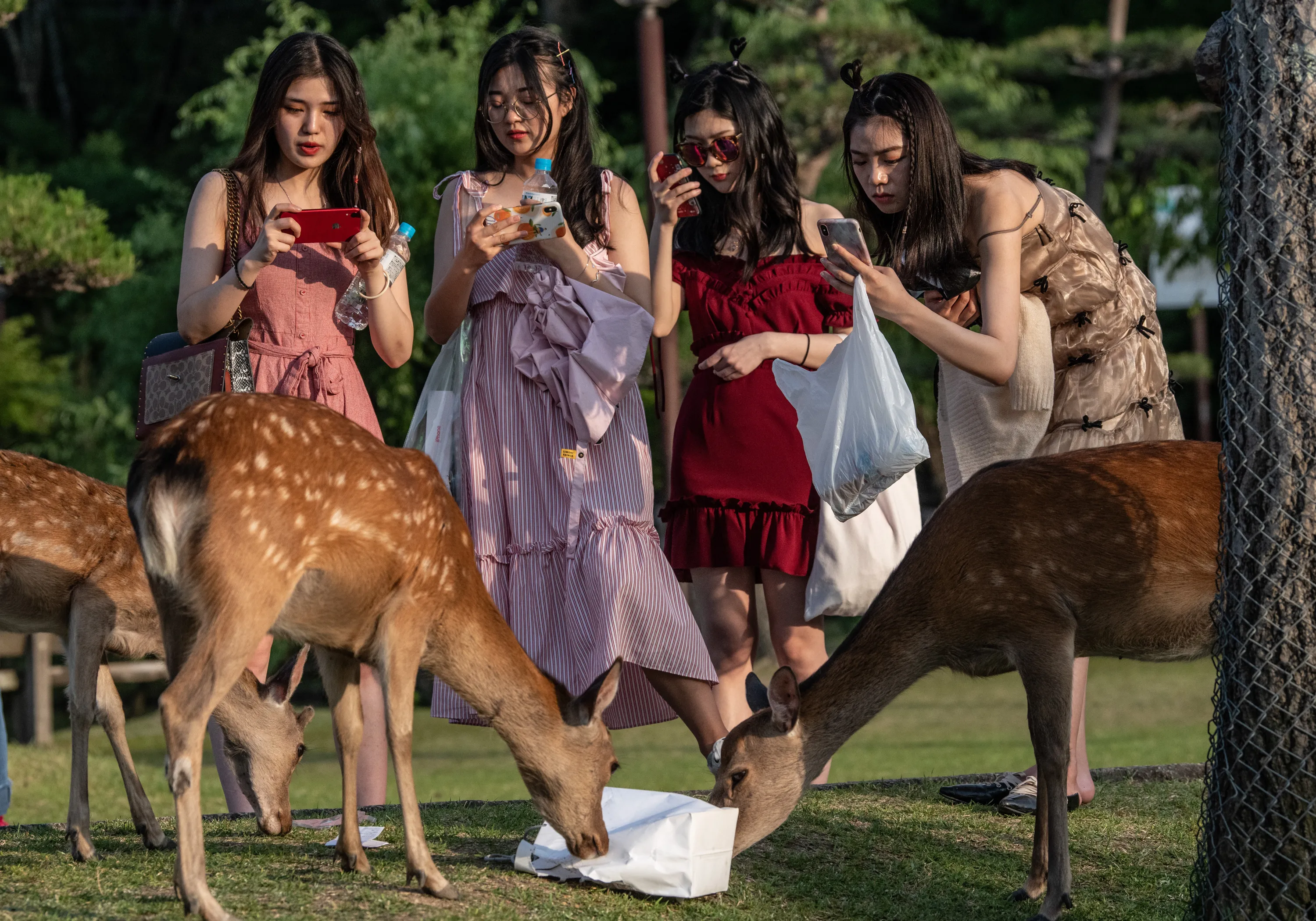 Tourists take photographs as a wild sika deer eats a bag on June 6, 2019 in Nara, Japan. Nara's free-roaming deer have become a huge attraction for tourists. However, an autopsy on a deer that was recently found dead near one of the city's famous temples discovered 3.2kg of plastic in its stomach and caused concern at the effect of tourism as Japan struggles to cope with a huge increase in domestic and international tourists. Alongside a growing Japanese tendency to holiday domestically, a record 31 million people visited the country in 2018 up 8.7 percent from the previous year, with many people now worrying about the environmental impact caused by such large visitor numbers. (Photo by Carl Court/Getty Images)