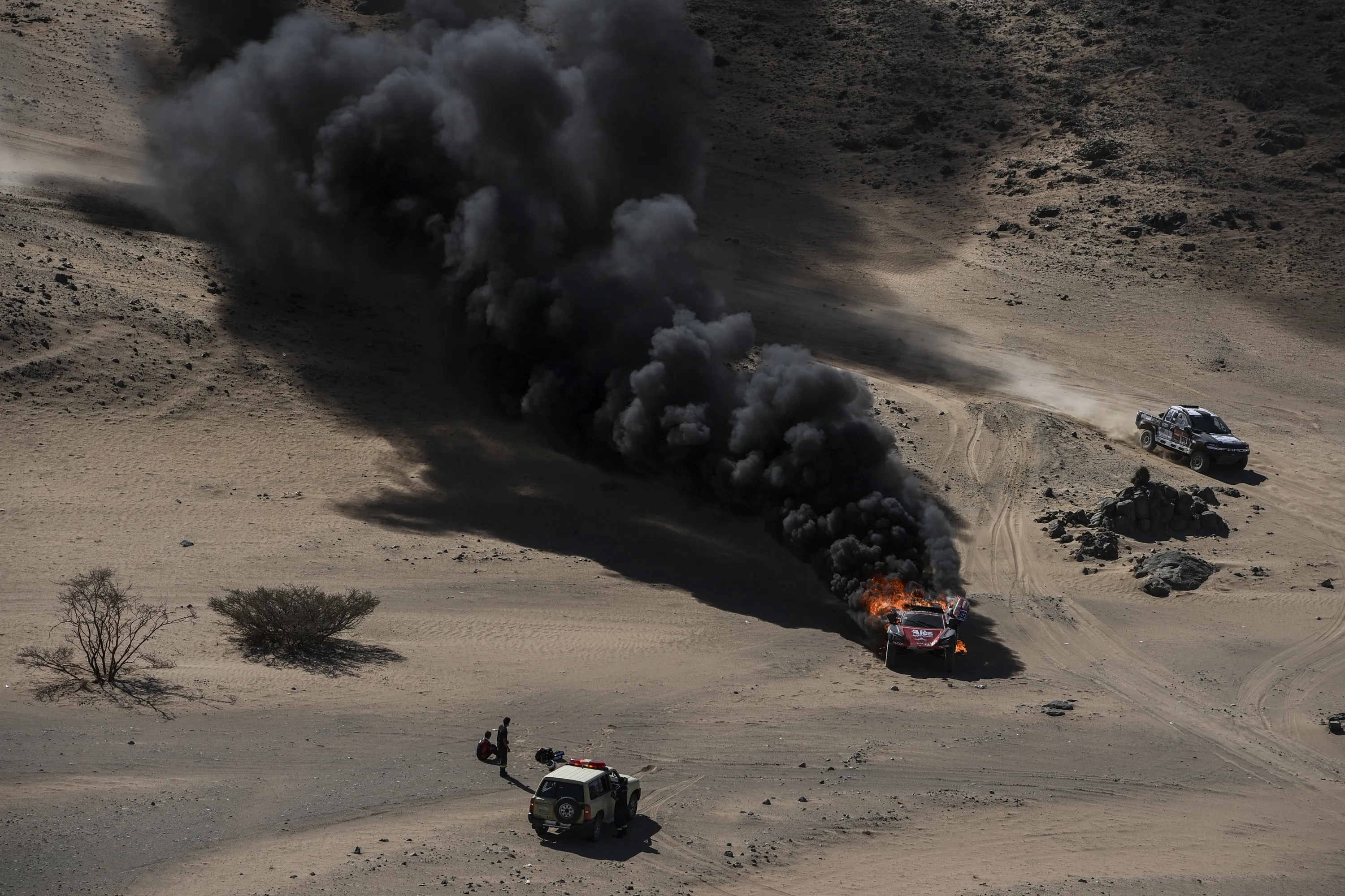 The car of driver Dumas Romain and co-driver Winocq Alexandre, of France, burns during stage one of the Dakar Rally, between Jiddah and Al Wajh, Saudi Arabia, Sunday, January 5, 2020. (Photo by Frank Fife/Pool Photo via AP Photo)