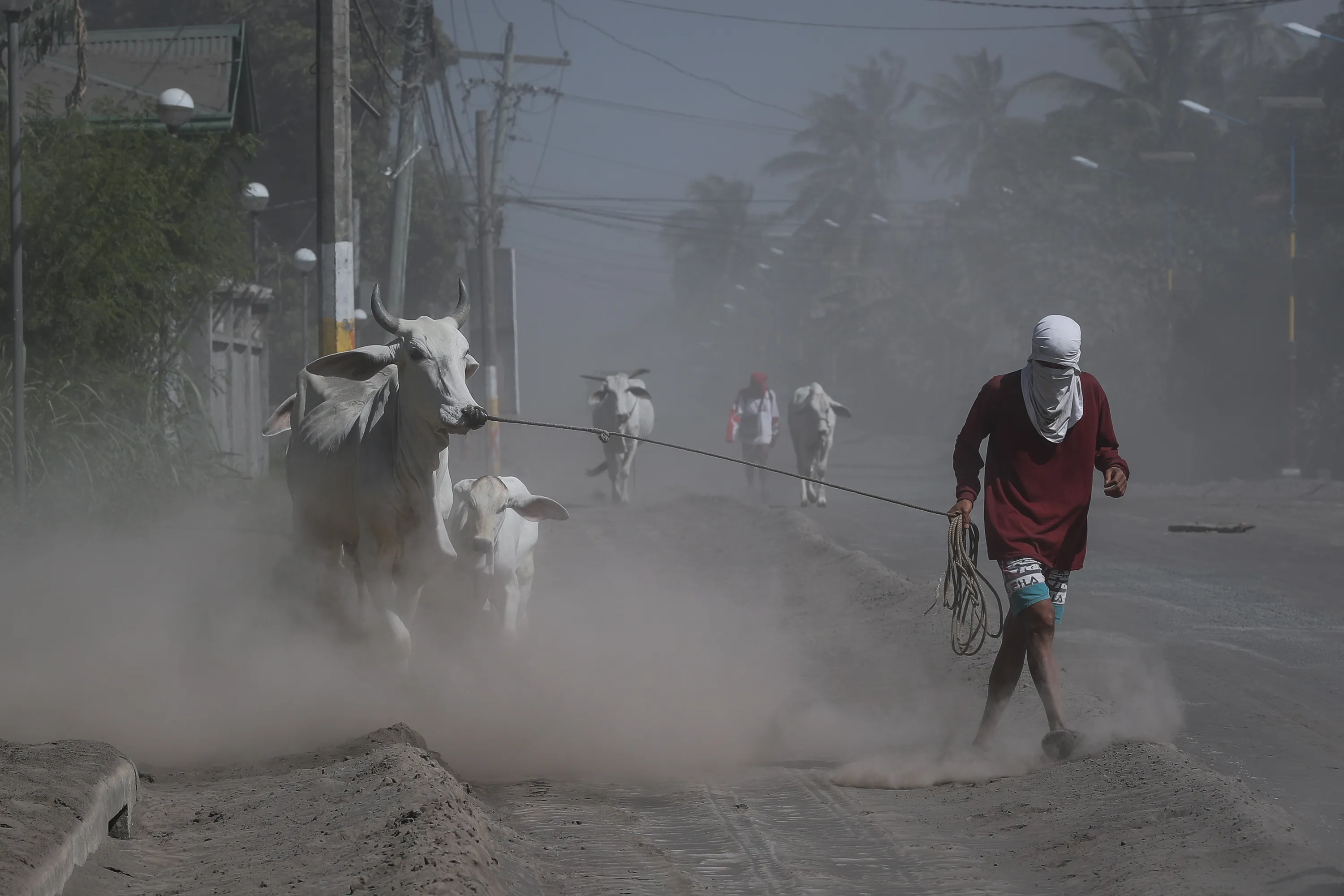 Residents pull their cows along a road in Agoncillo, Batangas, Philippines, 16 January 2020. The Philippine Institute of Volcanology and Seismology (PHIVOLCS) has kept the alert level at four, following Taal Volcano's eruption on 12 January 2020. (Photo by Mark R. Cristino/EPA/EFE)