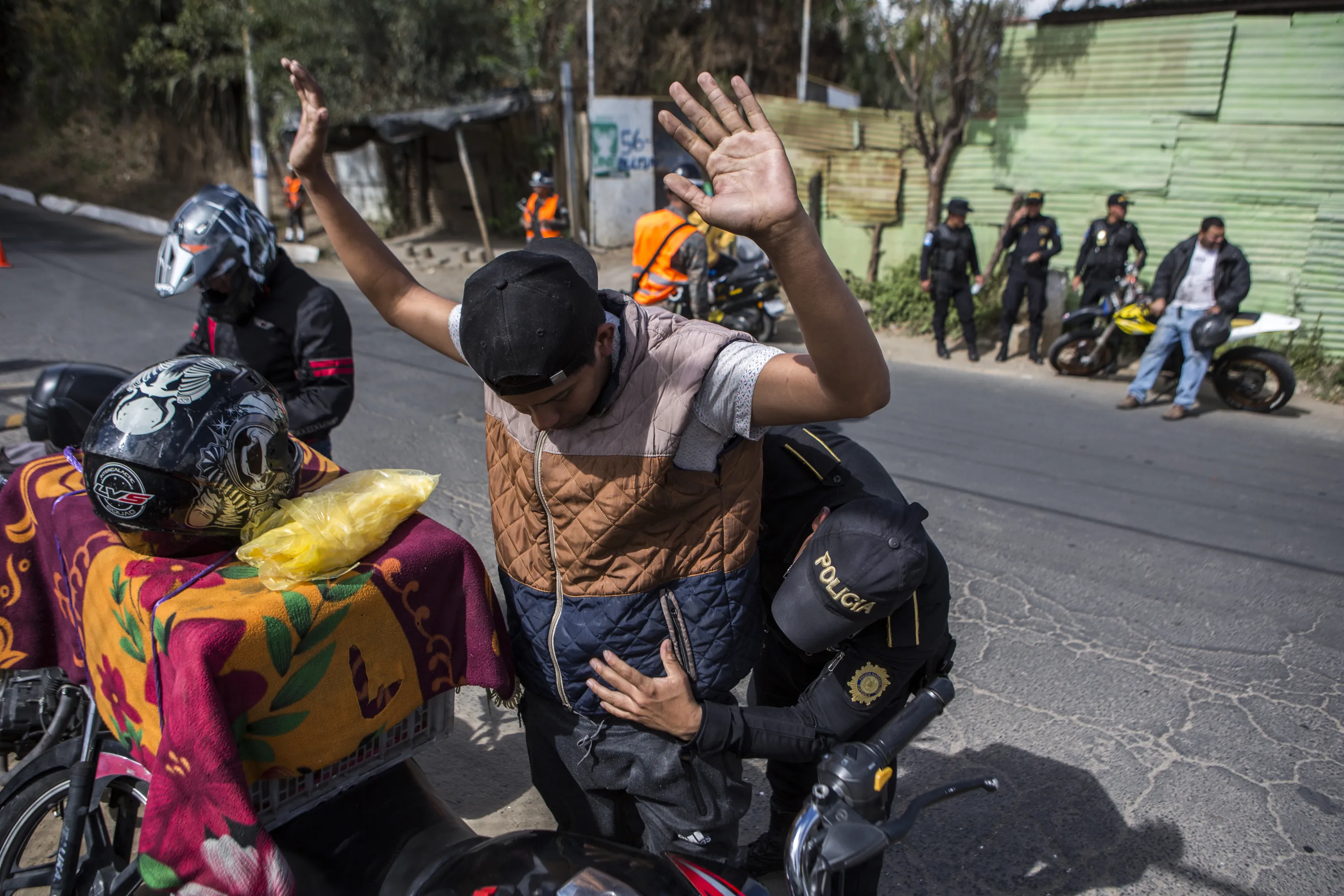 A police stops a motorcyclist to search him at a security checkpoint in the El Milagro area of the Mixco municipality on the outskirts of Guatemala City, Friday, January 17, 2020. Guatemala’s new president announced a state of alert for two municipalities with high crime rates to combat gang activity Friday, a measure that allows the deployment of military troops. (Photo by Oliver de Ros/AP Photo)