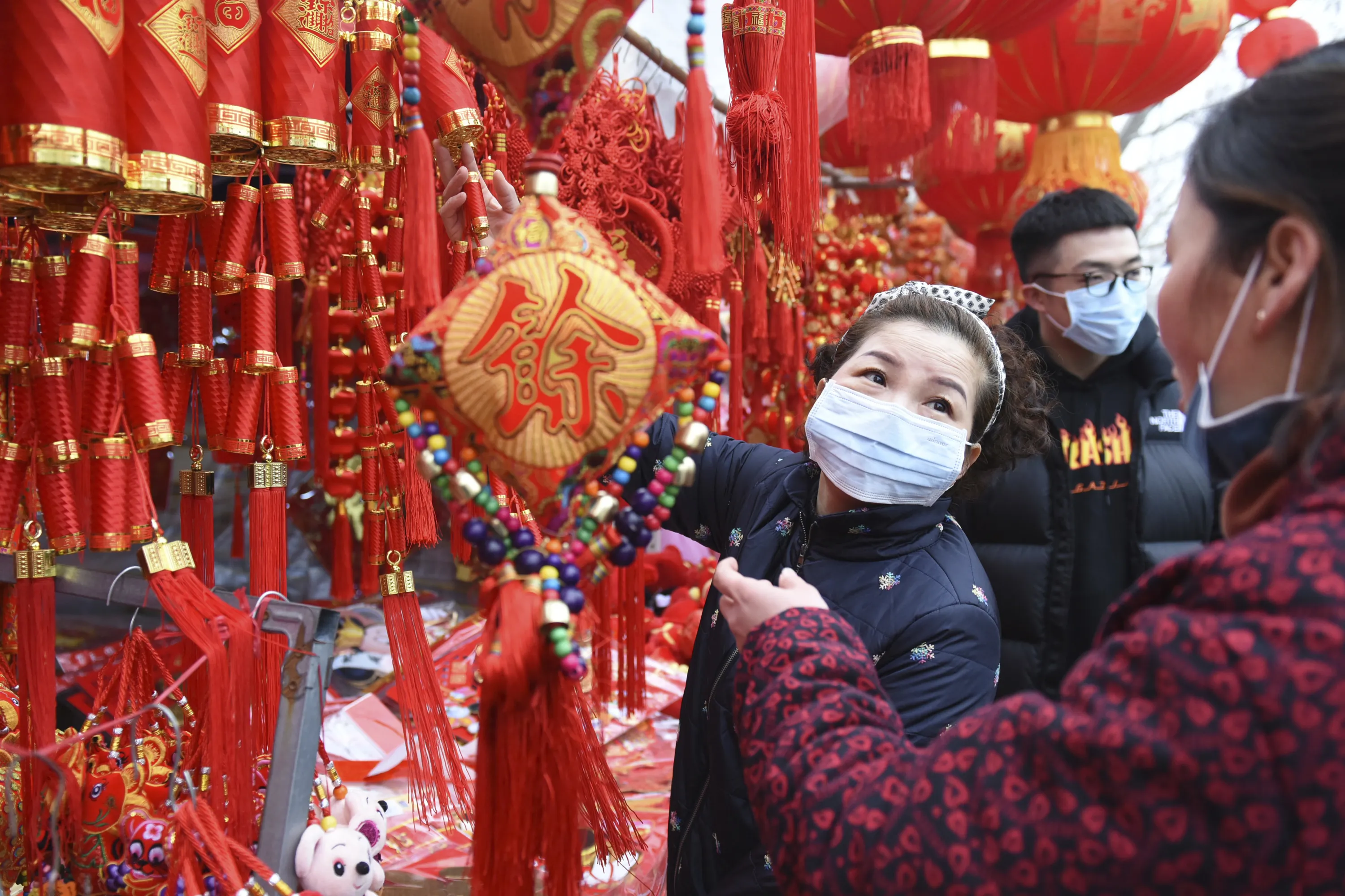 People wear face masks as they shop for decorations for the upcoming Lunar New Year, the Year of the Rat, at a market in Fuyang in central China's Anhui Province, Friday, January 24, 2020. China is swiftly building a hospital dedicated to treating patients infected with a new virus that has killed 26 people, sickened hundreds and prompted unprecedented lockdowns of cities home to millions of people during the country's most important holiday. (Photo by Chinatopix via AP Photo)