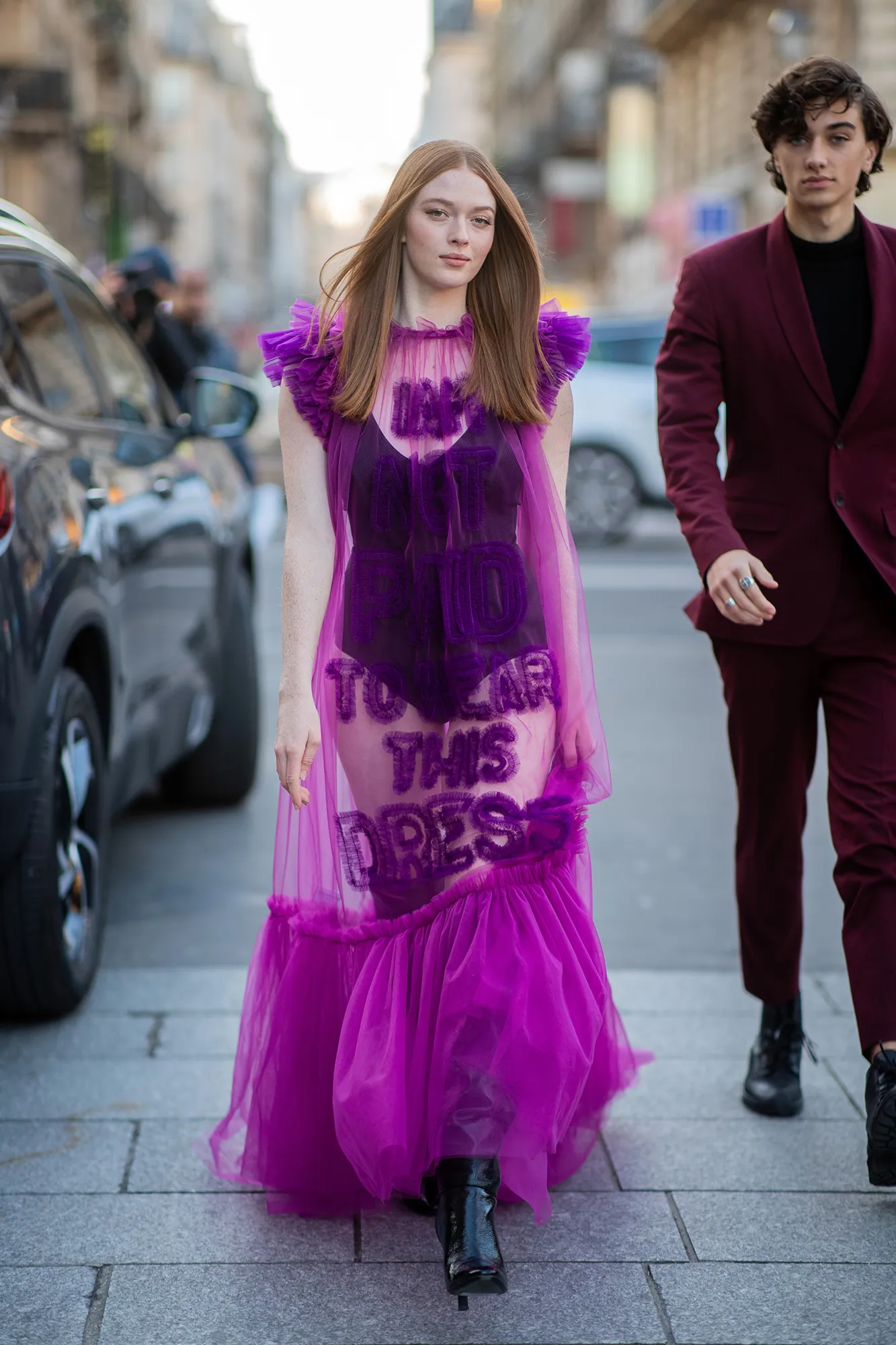Larsen Thompson seen wearing purple sheer dress outside Viktor & Rolf during Paris Fashion Week – Haute Couture Spring/Summer 2020 on January 22, 2020 in Paris, France. (Photo by Christian Vierig/Getty Images )