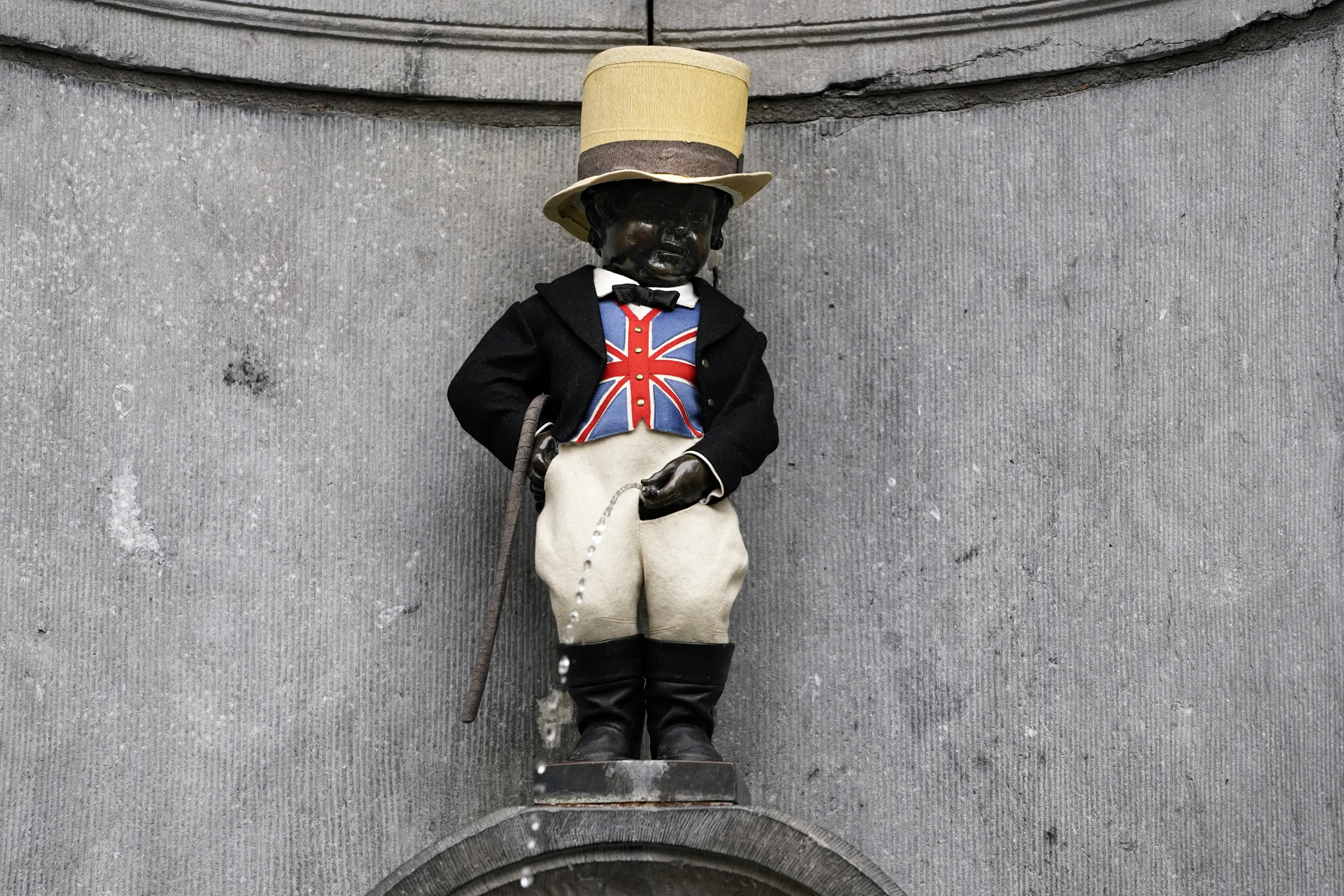 A picture taken on January 30, 2020 shows the Belgium landmark Manneken-Pis statue wearing a Union Jack flag waiscoast and a top hat to mark the departure of the United Kingdom from the European Union, in Brussels. Britain is set to leave the European Union at 2300 GMT on January 31, 2020, 43 months after Britons voted in the June 2016 referendum to leave the EU, ending more than four decades of economic, political and legal integration with its closest neighbours (Photo by Kenzo Tribouillard/AFP Photo)