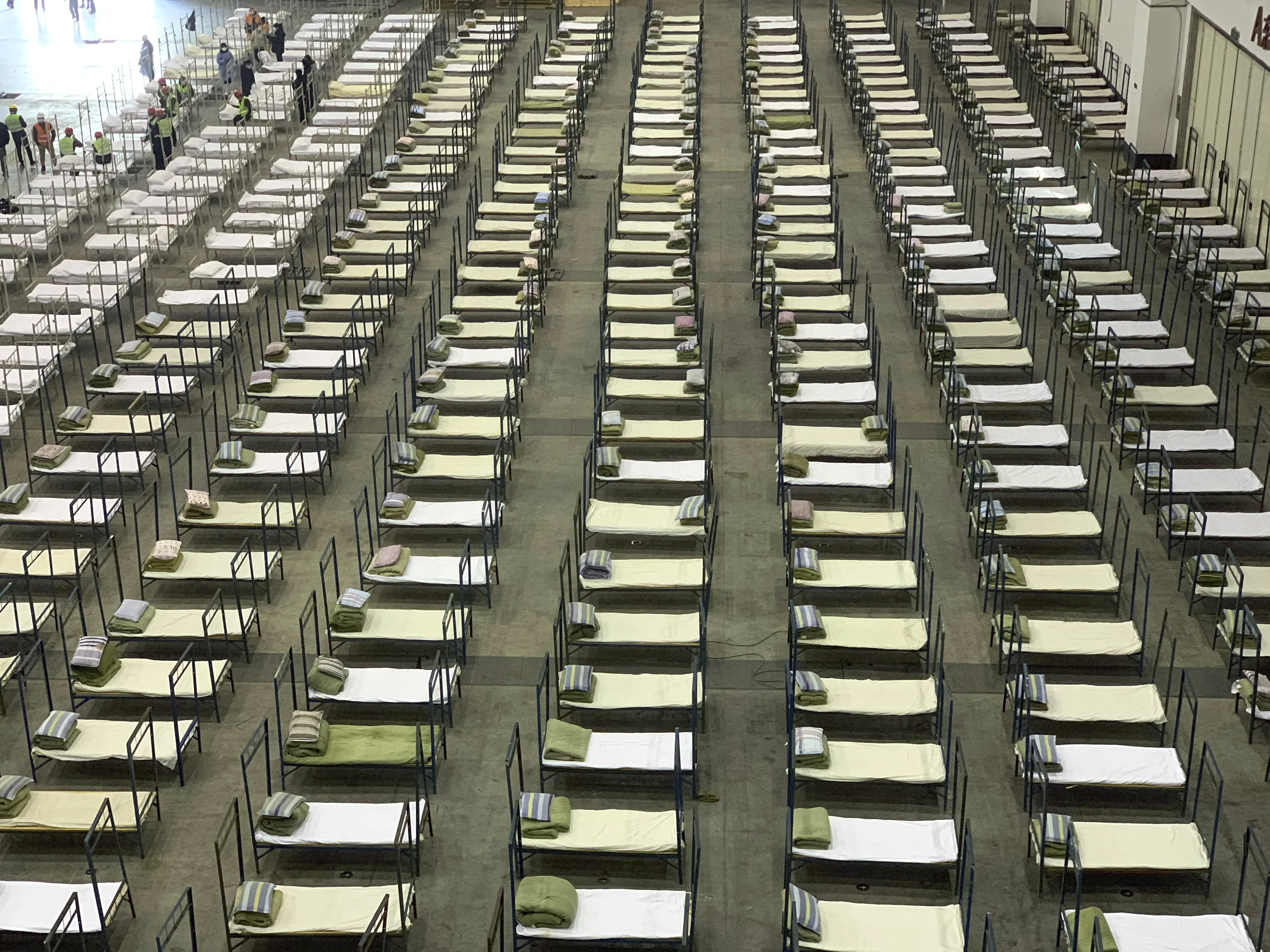 Workers arrange beds in a convention center that has been converted into a temporary hospital in Wuhan in central China's Hubei Province, Tuesday, February 4, 2020. China said Tuesday the number of infections from a new virus surpassed 20,000 as medical workers and patients arrived at a new hospital and President Xi Jinping said “we have launched a people's war of prevention of the epidemic”. (Photo by Chinatopix via AP Photo)