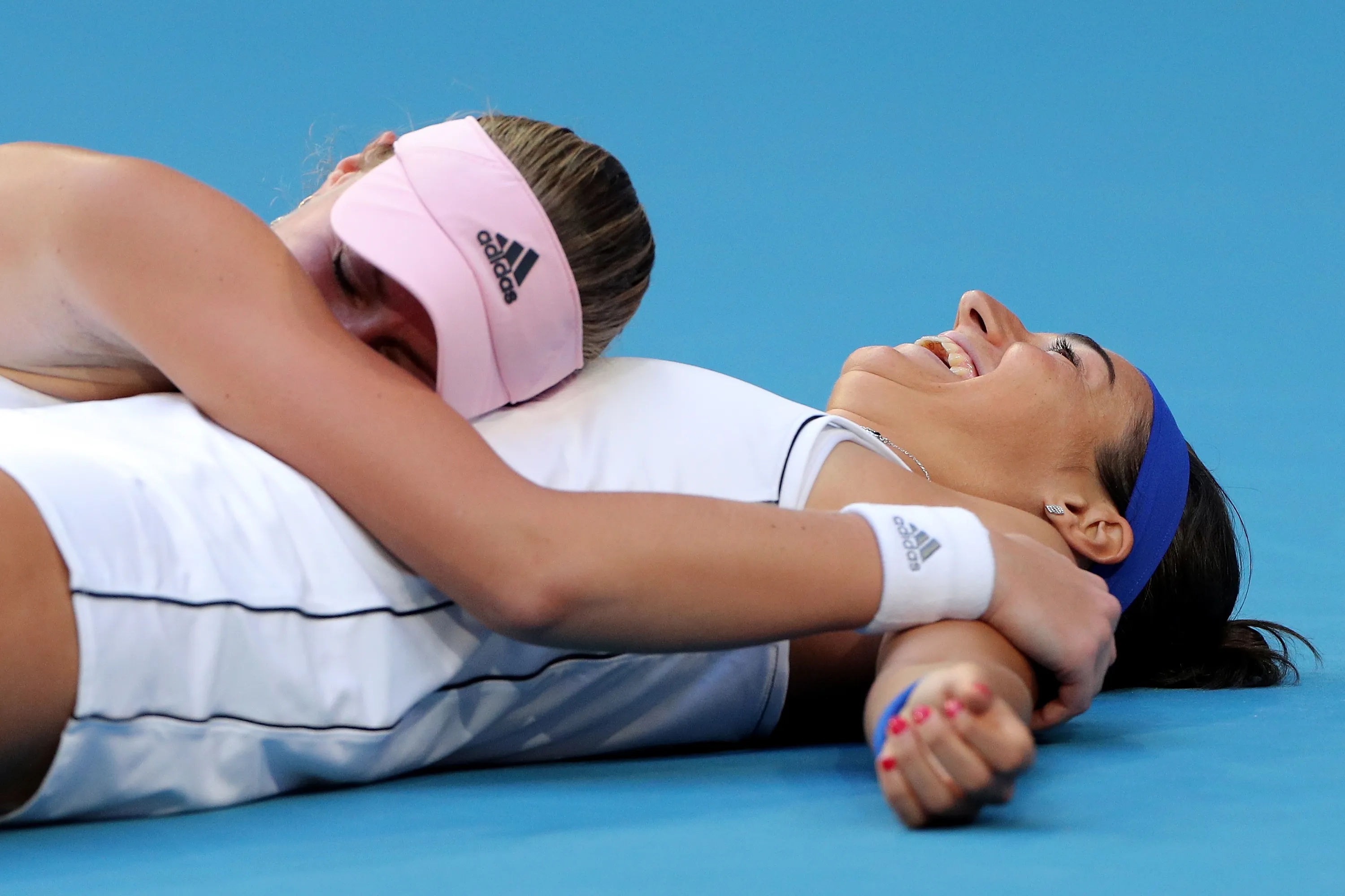 Caroline Garcia and Kristina Mladenovic of France celebrate winning the doubles match against Ash Barty and Sam Stosur of Australia on day 2 of the Fed Cup Final tennis competition between Australia and France at RAC Arena in Perth, Australia, 10 November 2019. (Photo by Richard Wainwright/EPA/EFE)