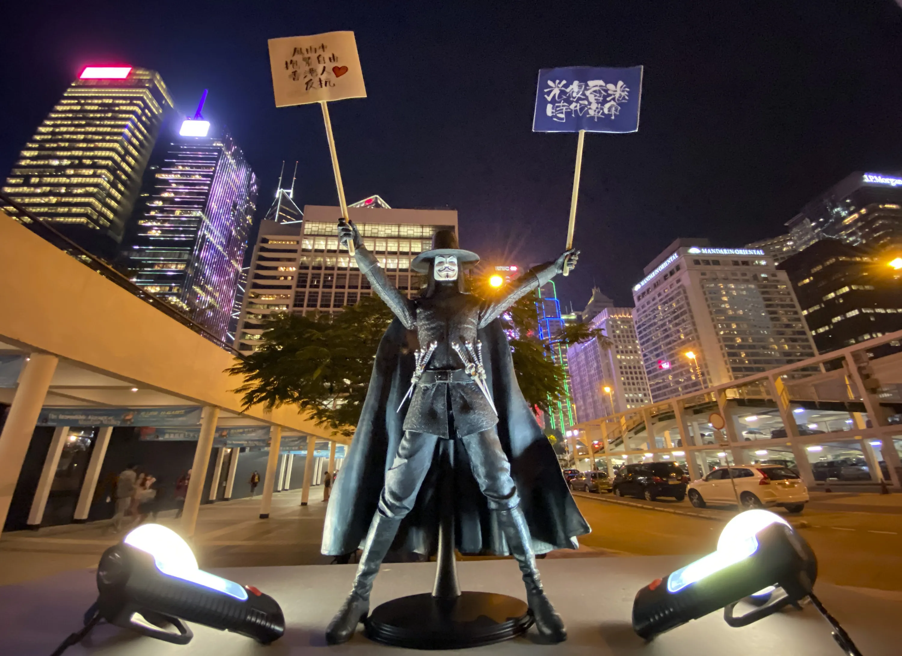 A miniature figure wearing artist Guy Fawkes mask and a sign reading “Liberate Hong Kong, Revolution of Our Times” is displayed during a rally against the use of tear gas by police in Hong Kong, Friday, December 6, 2019. Hong Kong police have fired more than 10,000 tear gas canisters to quell violent protests that have rocked the city for six months. Its heavy and prolonged use in Hong Kong – one of the world's most densely populated cities and known for its concrete jungle of high-rises – is unusual and has sparked health fears. (Photo by Vincent Thian/AP Photo)