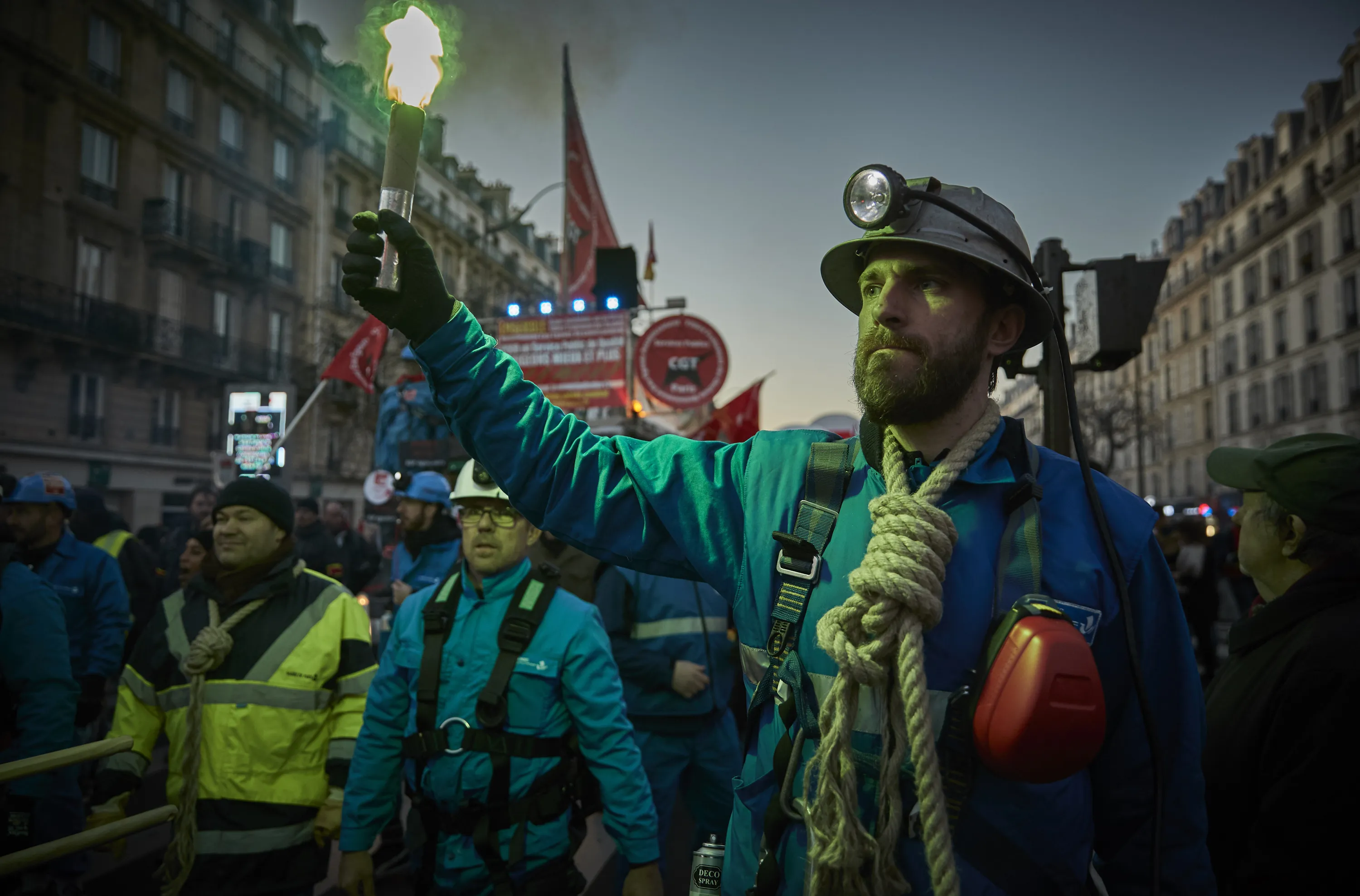 Paris sewer workers march through the streets of Paris on the 9th inter-professional day of strikes and demonstration against President Macron’s controversial pension reform on February 06, 2020 in Paris, France. President Macron is facing his biggest test since the Gilet Jaune or “Yellow Vest” movement as railway, transportation workers, Teachers, students, hospital employees, firemen, lawyers, garbage collectors are continuing the strike called in protest to changes to France’s pension system, currently being debated in parliament, which aims to merge 42 different pension schemes into a single, points-based system, to have everyone in France retire at the same time. (Photo by Kiran Ridley/Getty Images)