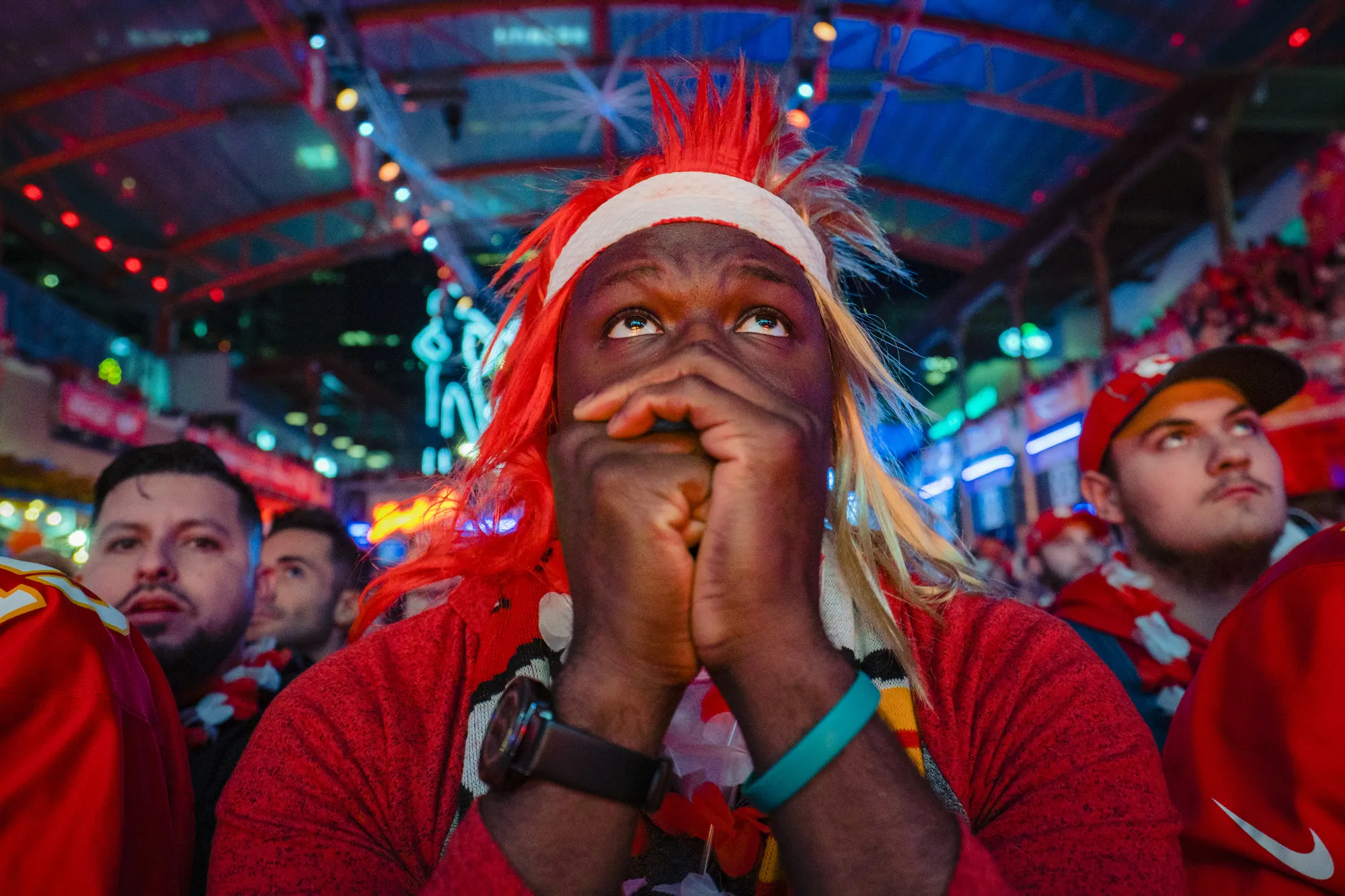 Fans cheer on the Chiefs at the Power and Light District as the Kansas City Chiefs play the San Francisco 49ers in the Super Bowl on February 2, 2020 in Kansas City, Kansas. (Photo by Kyle Rivas/Getty Images)