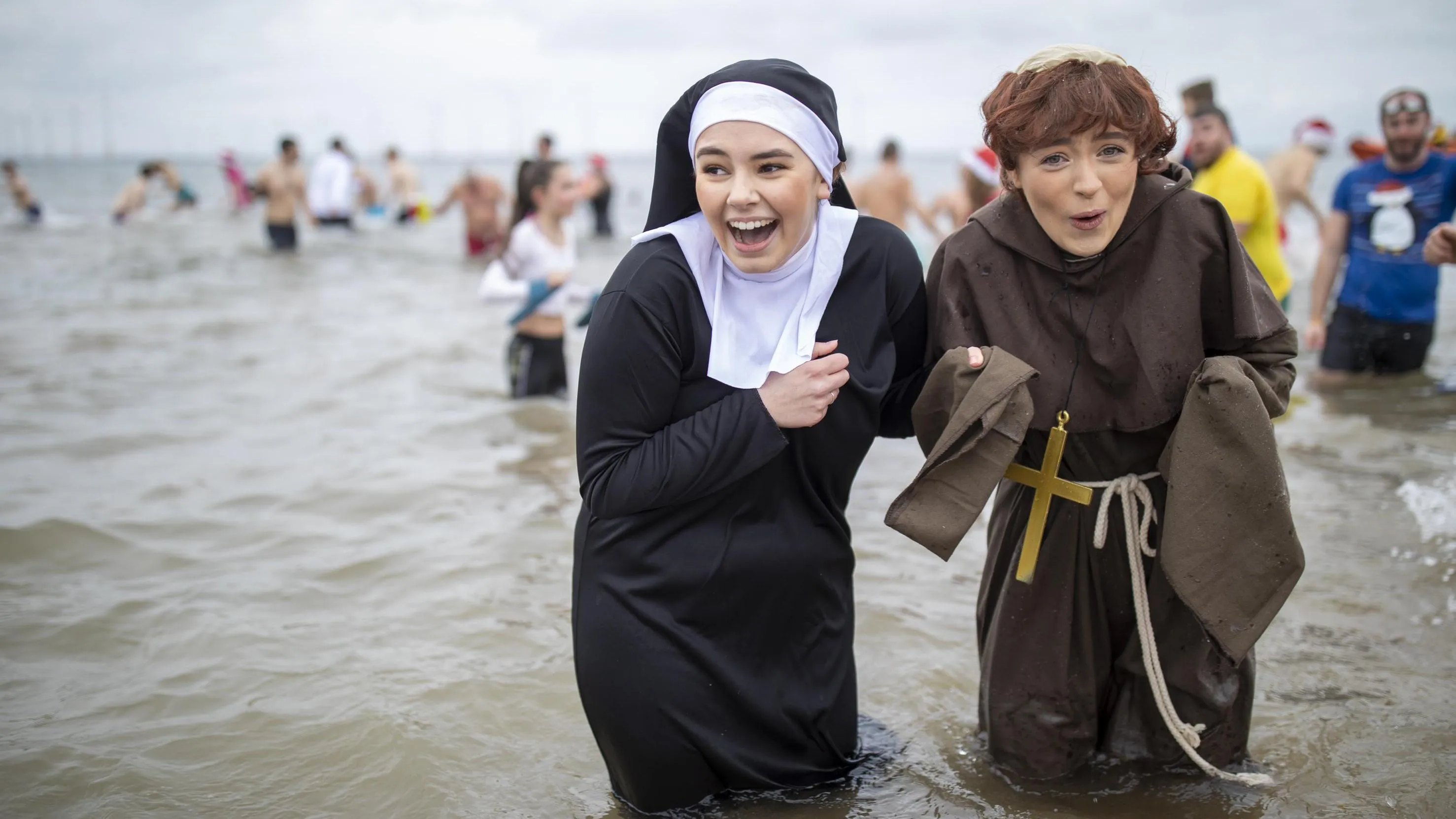 Bathers brave the cold waters of the North Sea as they take part in the annual Boxing Day dip at Redcar Beach on December 26, 2019 in Redcar, England. The event attracts hundreds of people each year who take to the cold water wearing fancy dress as they help to raise money for a number of charities. (Photo by James Glossop/The Times)