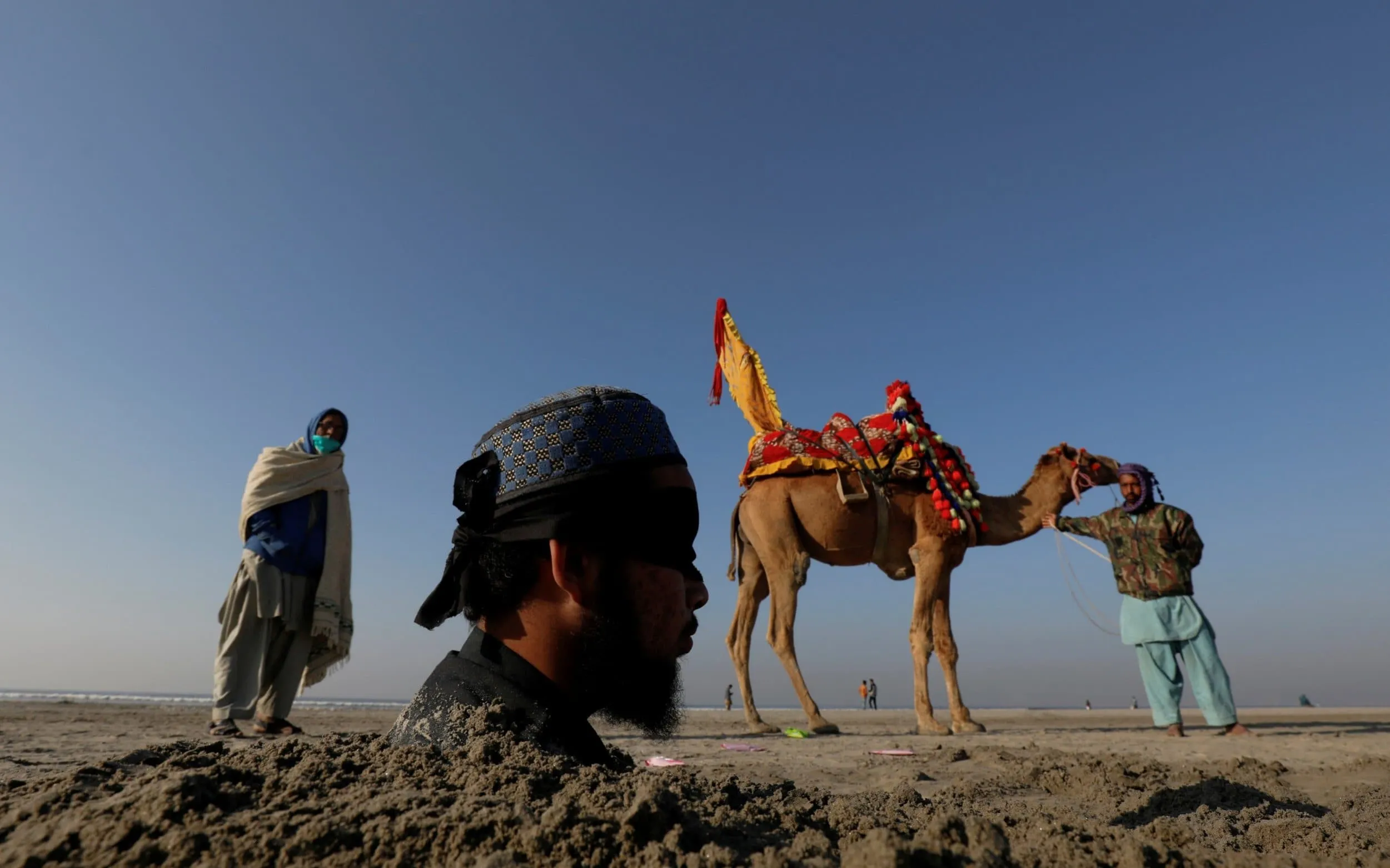 Mehrban Akhtar, 20, blindfolded and buried up to his neck in sand during a solar eclipse, is pictured along Clifton beach in Karachi, Pakistan on December 26, 2019. Many Pakistanis believe that burying people with disabilities in sand during solar eclipse would bring healing to their bodies. (Photo by Akhtar Soomro/Reuters)