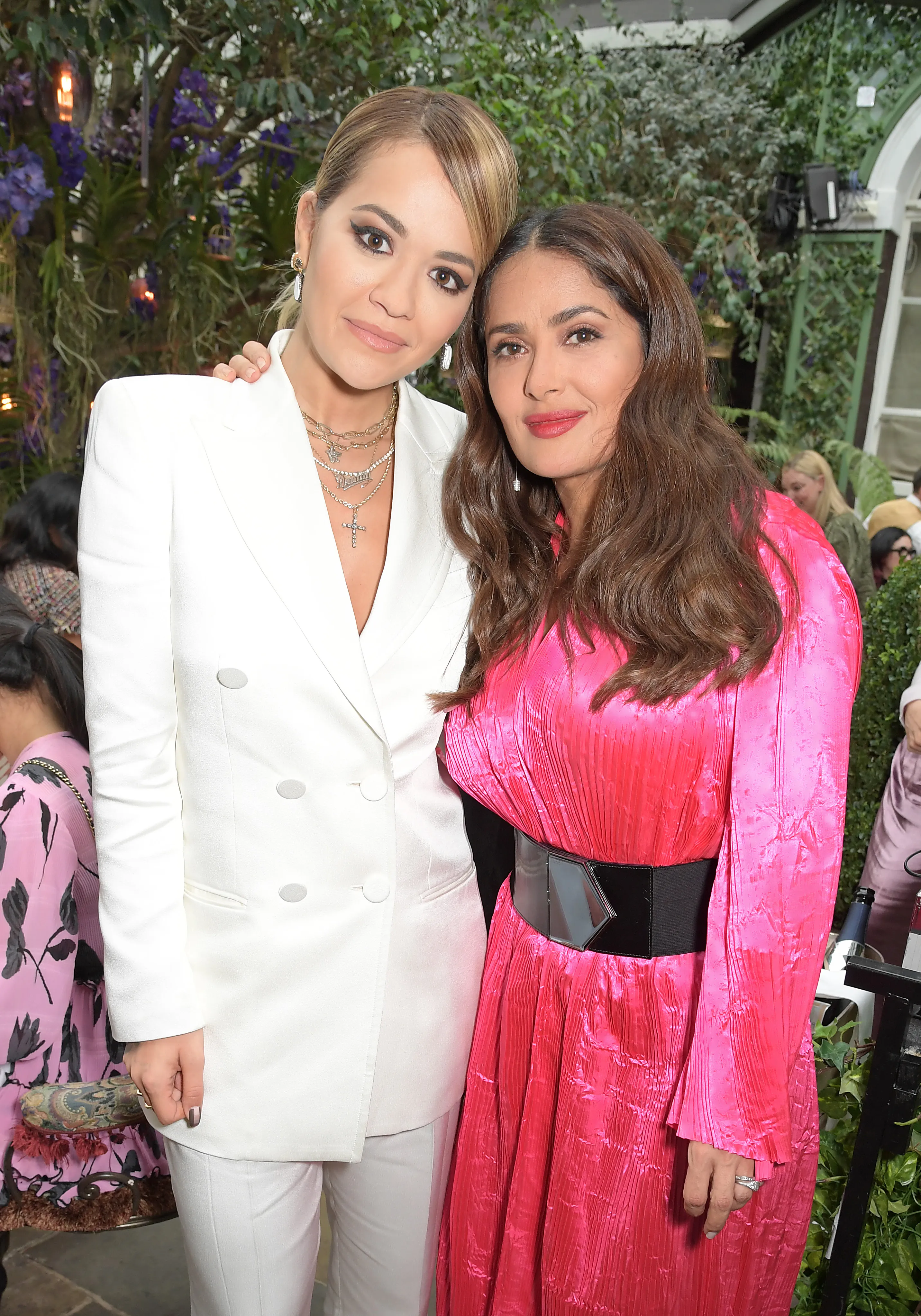 Rita Ora (L) and Salma Hayek Pinault attend International Women's Day for The Caring Foundation with Salma Hayek at Annabel's on March 08, 2020 in London, England. (Photo by David M. Benett/Dave Benett/Getty Images for Annabel's)
