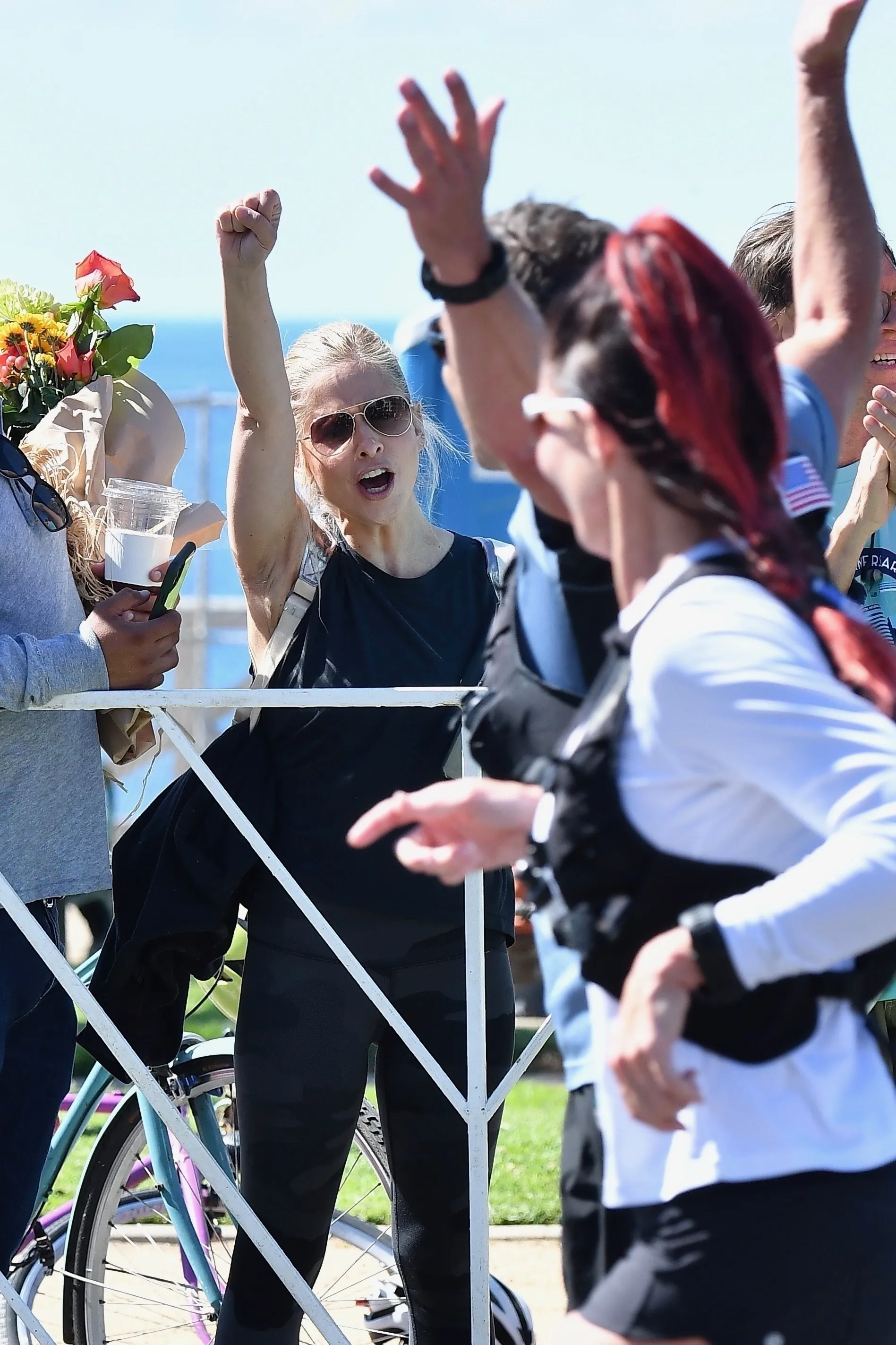 Sarah Michelle Gellar and her daughter Charlotte cheer on a friend running in the Los Angeles Marathon in Santa Monica, CA. on March 8, 2020. (Photo by Backgrid USA)