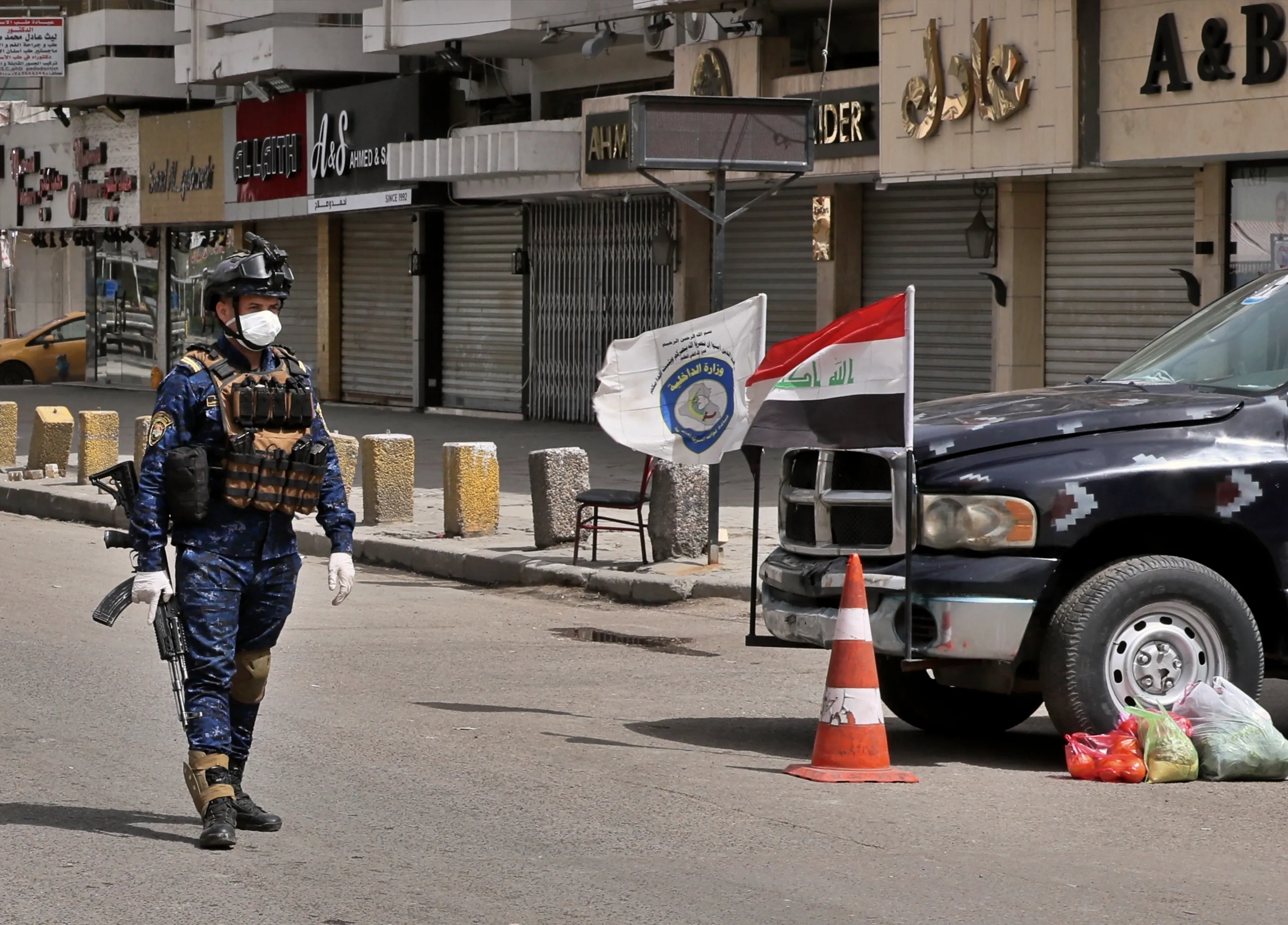 A federal policeman mans a checkpoint near shops that are shuttered to help prevent the spread of the coronavirus, in Baghdad, Iraq, Thursday, March 19, 2020. Iraq announced a weeklong curfew to help fight the COVID-19 pandemic. (Photo by Hadi Mizban/AP Photo)