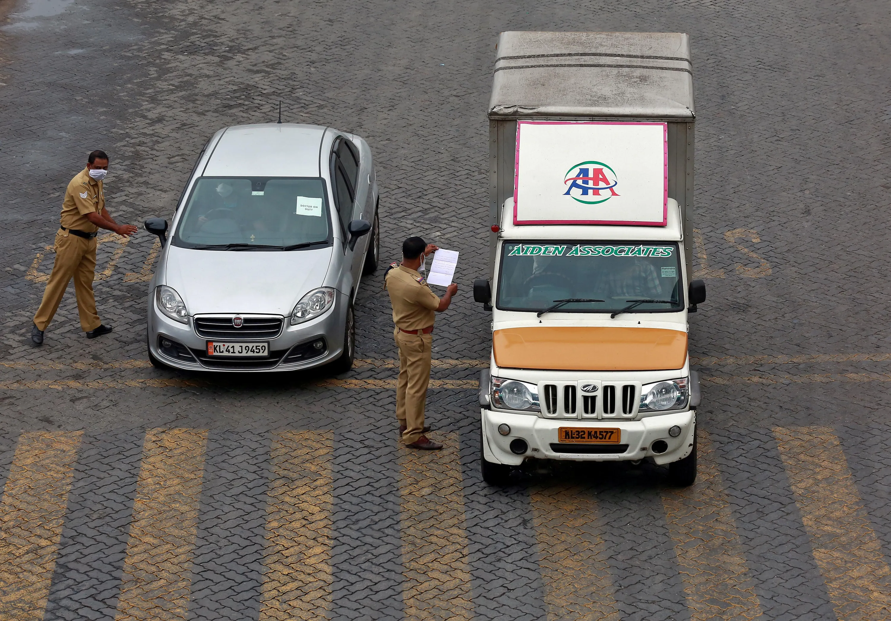Police officers stop vehicles and check their papers on a highway during 21-day nationwide lockdown to limit the spreading of coronavirus disease (COVID-19), in Kochi, India, March 25, 2020. (Photo by Sivaram V/Reuters)