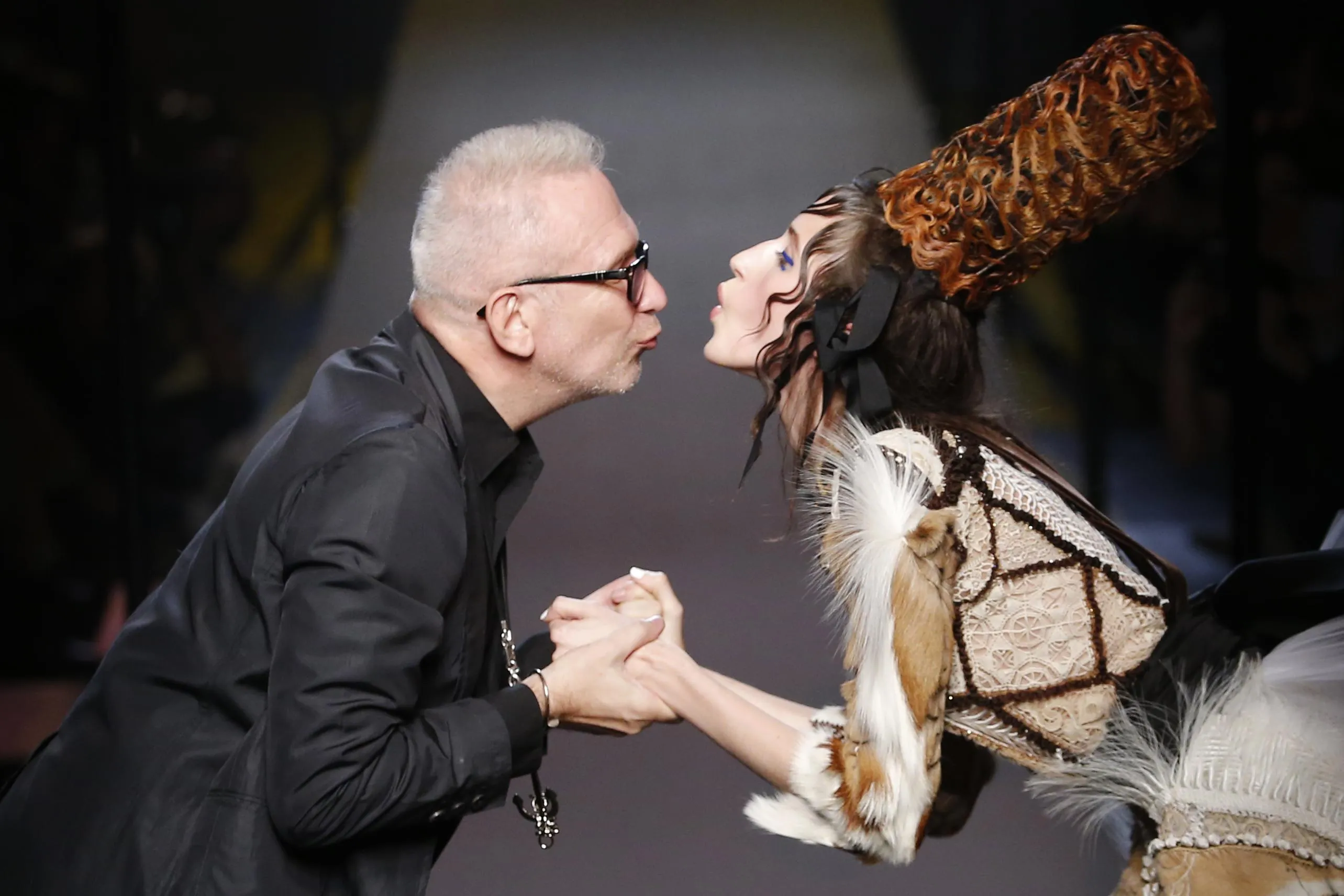 French designer Jean Paul Gaultier (L) appears with model Anna Cleveland at the end of his Haute Couture Fall Winter 2015/2016 fashion show in Paris, France, July 8, 2015. (Photo by Stephane Mahe/Reuters)