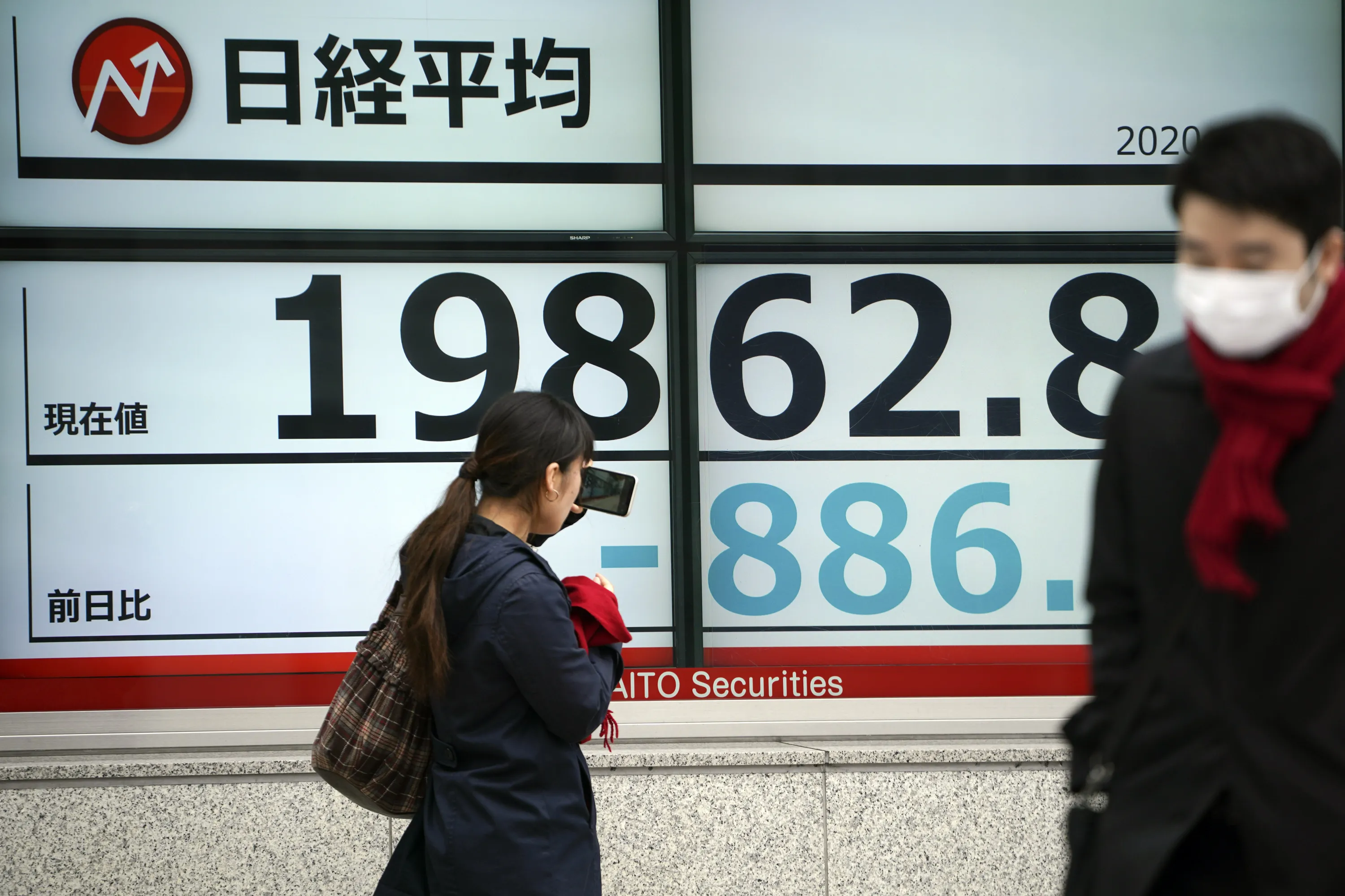 A woman takes a photo of an electronic stock board showing Japan's Nikkei 225 index at a securities firm in Tokyo Monday, March 9, 2020. Asian stock markets plunged Monday after global oil prices nosedived on worries a global economy weakened by a virus outbreak might be awash in too much crude. Tokyo's benchmark tumbled 4.7%. (Photo by Eugene Hoshiko/AP Photo)