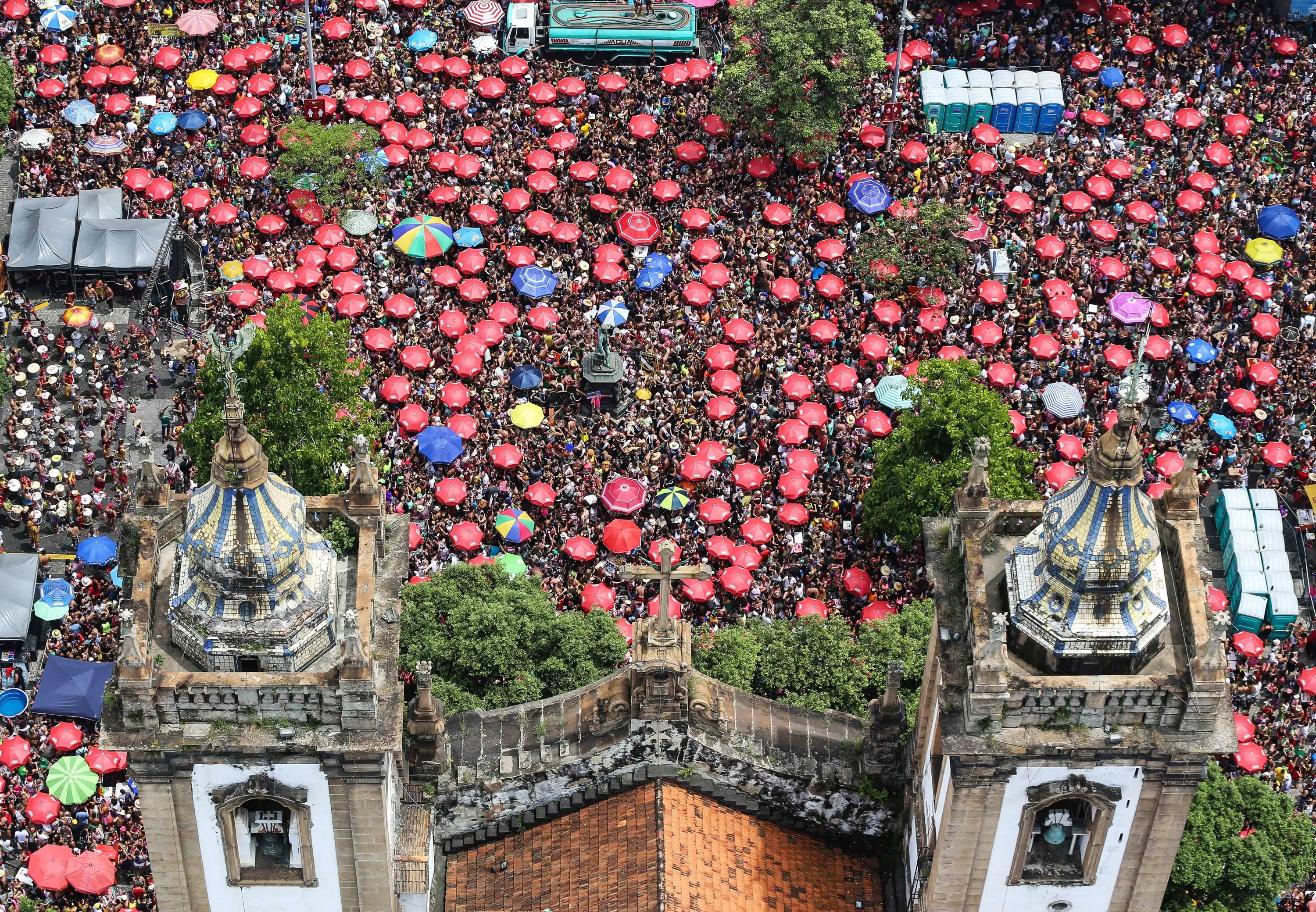 A handout photo made available by the Tourist Information center in Rio de Janeiro (RioTur) shows thousands of people joining the 'Fogo e Paixao' troupe to celebrate in advance the carnival party in downtown Rio de Janeiro, Brazil, 16 February 2020. Hundreds of street groups turned to the streets of Brazil in anticipation of the Rio de Janeiro Carnival, the most popular festival in the country. (Photo by Fernando Maia/EPA/EFE)