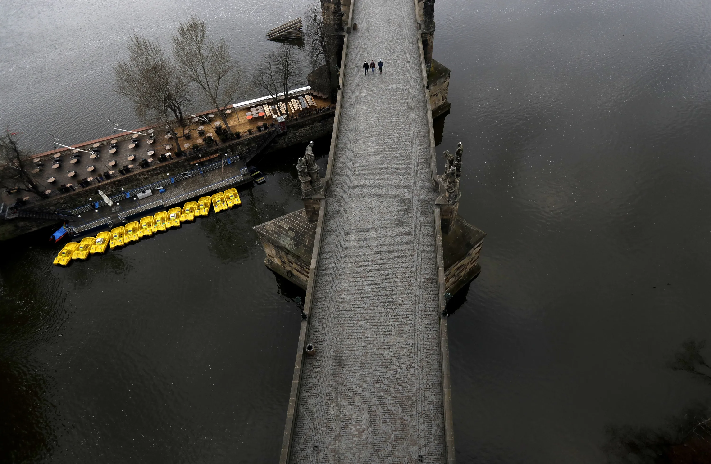 People walk across near empty Charles Bridge in Prague, Czech Republic, Friday, March 20, 2020. The Czech Republic's government has approved further dramatic measures to try and stem the spread of the novel coronavirus called COVID-19. The Prague castle is in the background. (Photo by Petr David Josek/AP Photo)
