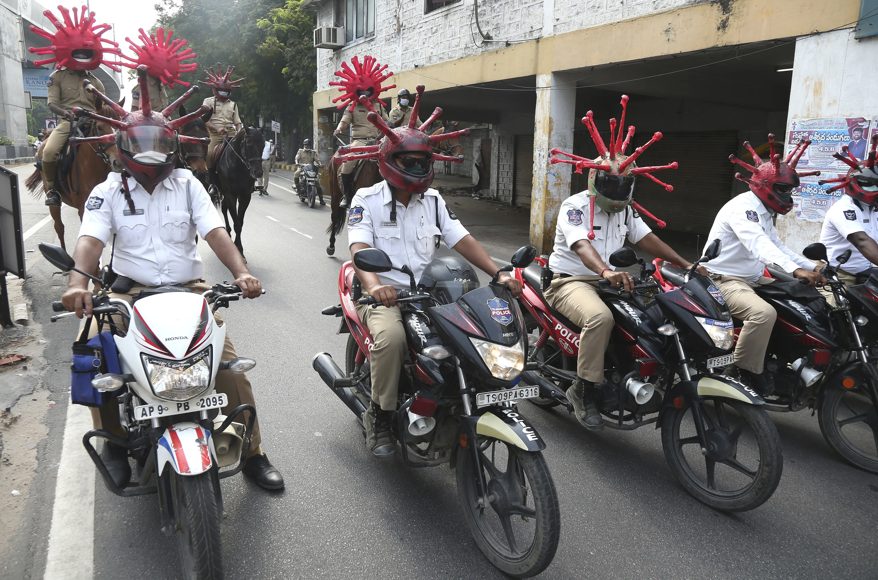 Indian policeman wearing virus themed helmets ride on motorcycles during an awareness rally aimed at preventing the spread of new coronavirus in Hyderabad, India, Thursday, April 2, 2020. (Photo by Mahesh Kumar A./AP Photo)