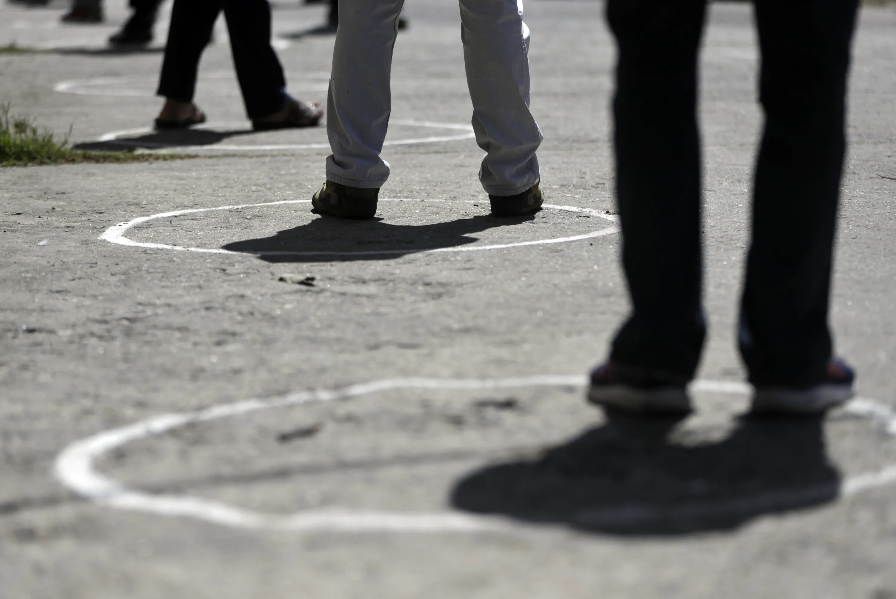 Nepalese people maintain social distance as they wait to buy daily groceries at fair priced shops opened by government during lockdown in Kathmandu, Nepal, Thursday, April 2, 2020. (Photo by Niranjan Shrestha/AP Photo)