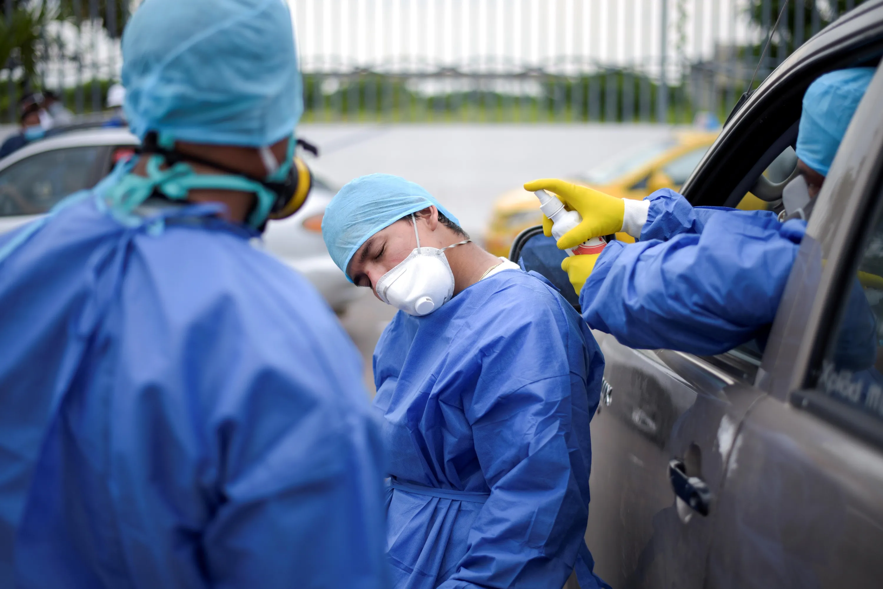 A hospital worker is sprayed with disinfectant at Guasmo Sur General Hospital in Guayaquil, Ecuador on April 1, 2020. (Photo by Vicente Gaibor del Pino/Reuters)