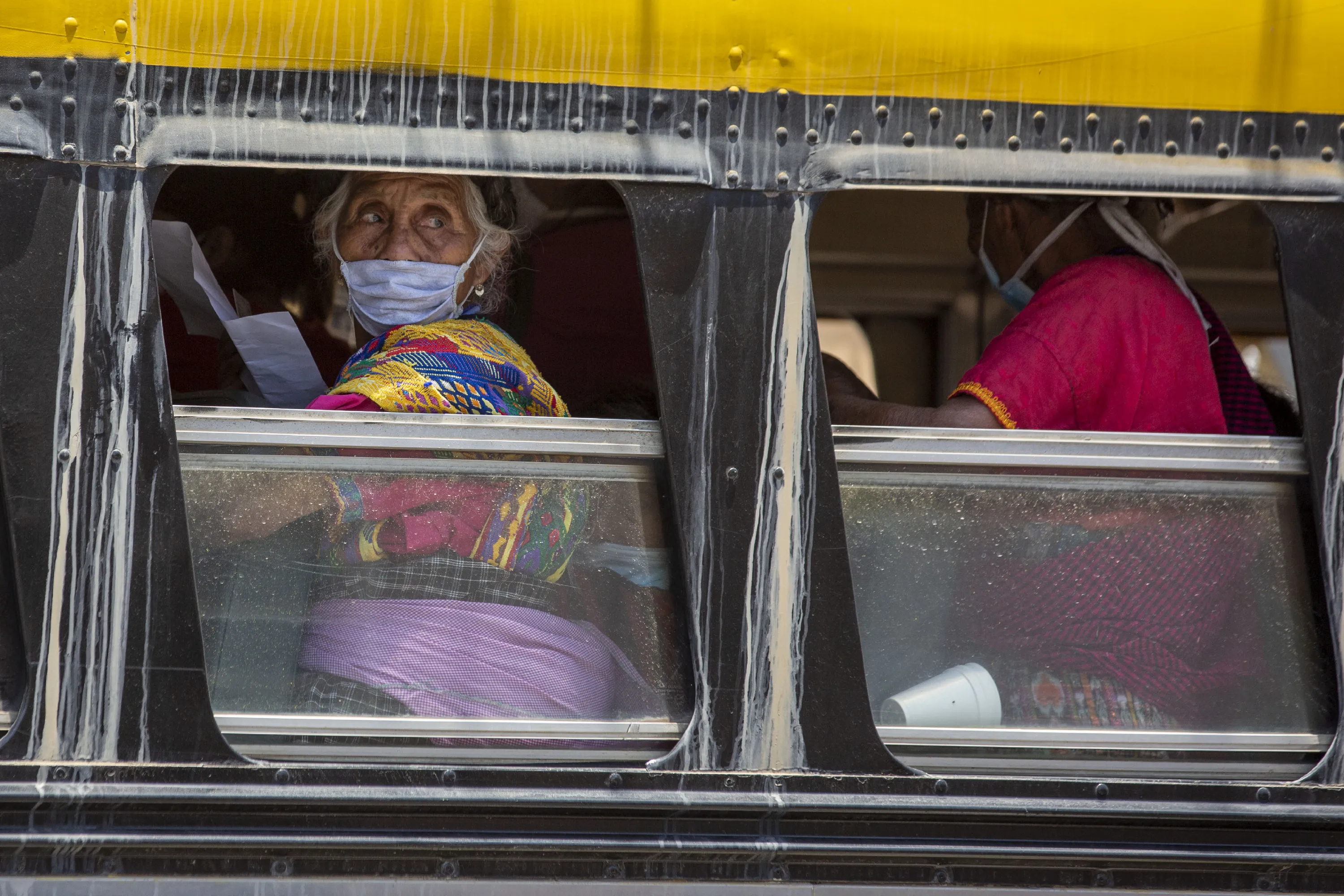 Women members of an organization of widows of bus drivers victims of violence, stand in a bus after being given food by officials of the Ministry of Social Development, in Guatemala City, Thursday, April 2, 2020. The Guatemalan government began to deliver food to people without income as a way to mitigate the spread of COVID-19. (Photo by Moises Castillo/AP Photo)