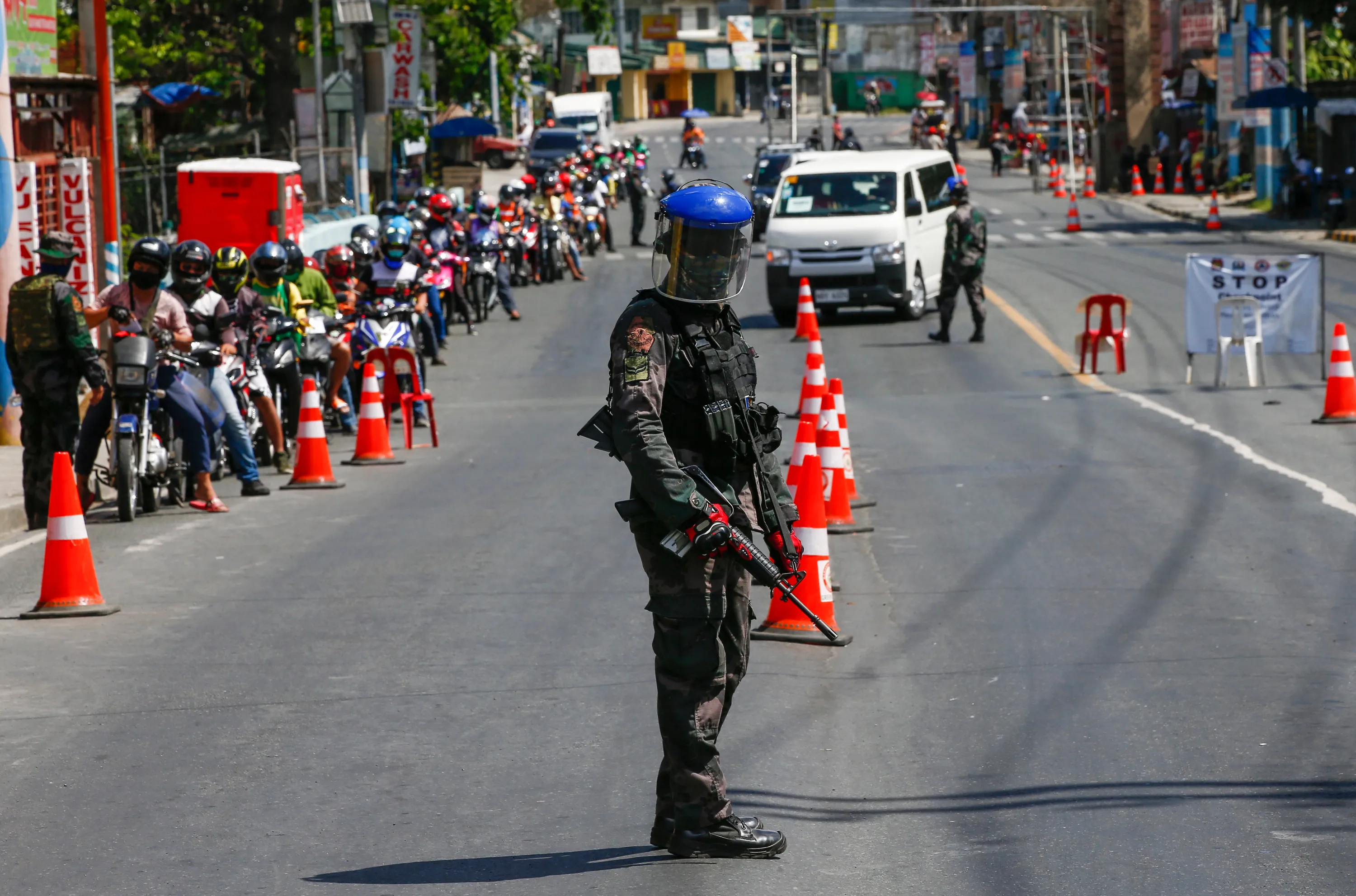 A police officer guards a checkpoint at the border between Rizal province and Marikina City, Metro Manila, Philippines 02 April 2020. In a late night broadcast on 01 April, Philippine President Rodrigo Duterte warned against intimidating and challenging the government, and ordered police and military to “shoot dead” troublemakers who will endanger the lives of security forces. (Photo by Rolex Dela Pena/EPA/EFE)