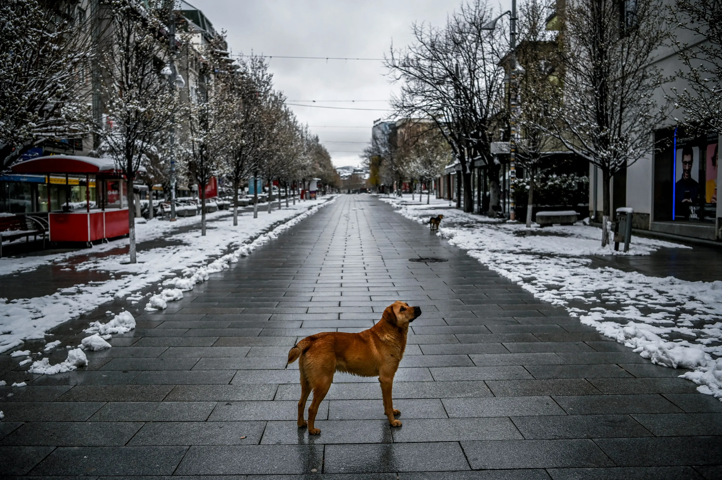 A stray dog stands on a snow-covered deserted square in Pristina on April 1, 2020, during a government-imposed curfew from 5pm to 5am, as part of preventive measures against the spread of the COVID-19, the novel coronavirus. (Photo by Armend Nimani/AFP Photo)