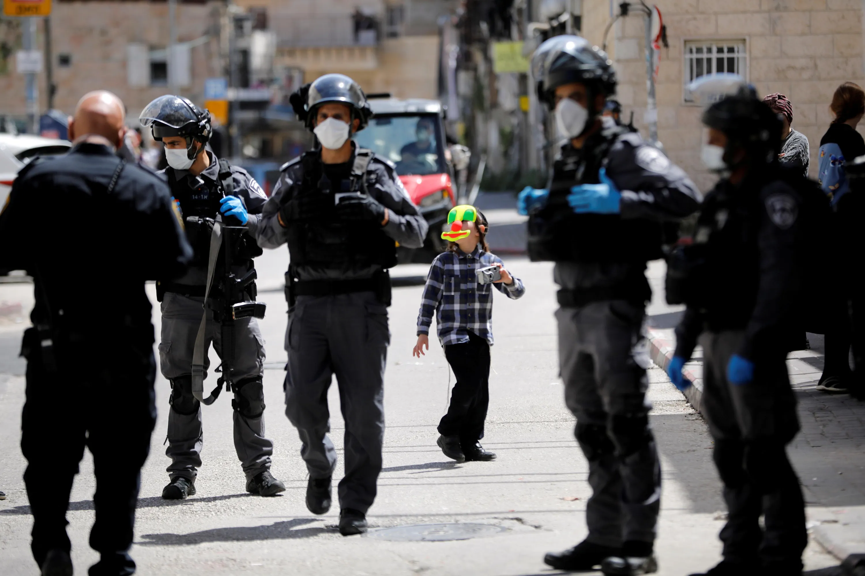 A boy wears a clown mask next to Israeli police as they patrol to enforce government restrictions set in place to curb the spread of the coronavirus disease (COVID-19), in Mea Shearim neighborhood of Jerusalem on April 6, 2020. (Photo by Ronen Zvulun/Reuters)