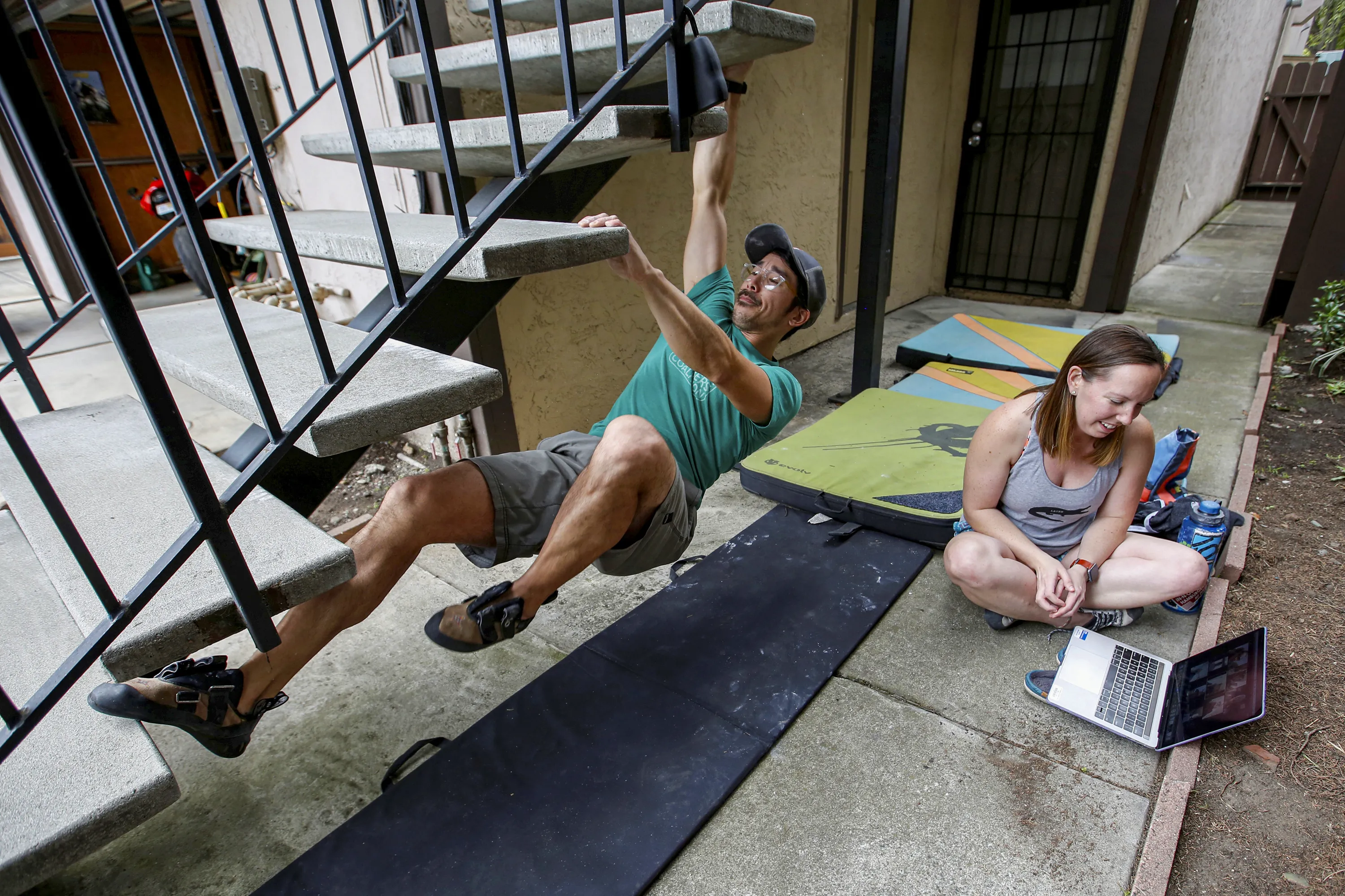 Scott Fong practices rock climbing on a staircase outside his home as his partner Claire Brady video chats with her family in place of their annual gathering on Good Friday, as 40 million Californians continue to shelter in place due to the coronavirus disease (COVID-19) outbreak, in Redwood City, California, U.S. April 10, 2020. (Photo by Stephen Lam/Reuters)