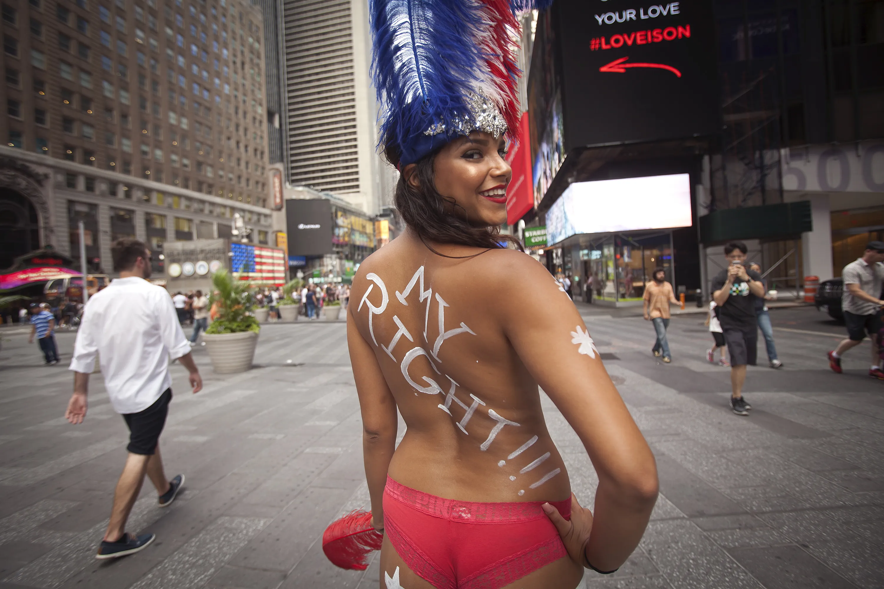 A model who poses for tips wearing body paint and underwear poses for a portrait in Times Square in New York, August 19, 2015. She declined to give her name. New York City created a task force on Thursday to examine how it can rein in topless women and costumed cartoon and superhero characters who officials believe are aggressively soliciting tips after posing for tourists' pictures in Times Square. (Photo by Carlo Allegri/Reuters)