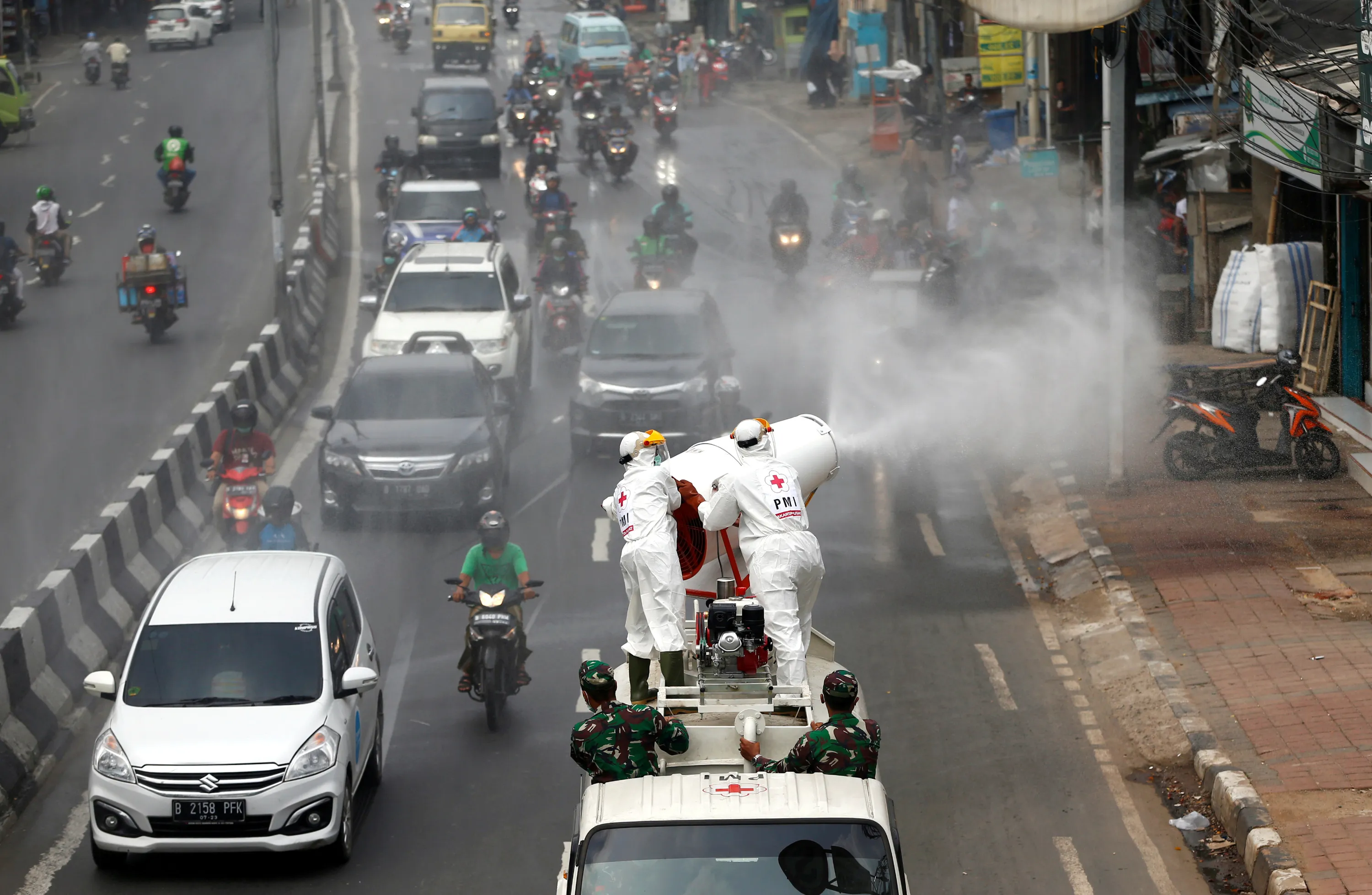 Indonesia's Red Cross personnel wearing protective suits spray disinfectant on the road to prevent the spread of the coronavirus disease (COVID-19) in Jakarta, Indonesia, March 28, 2020. (Photo by Ajeng Dinar Ulfiana/Reuters)