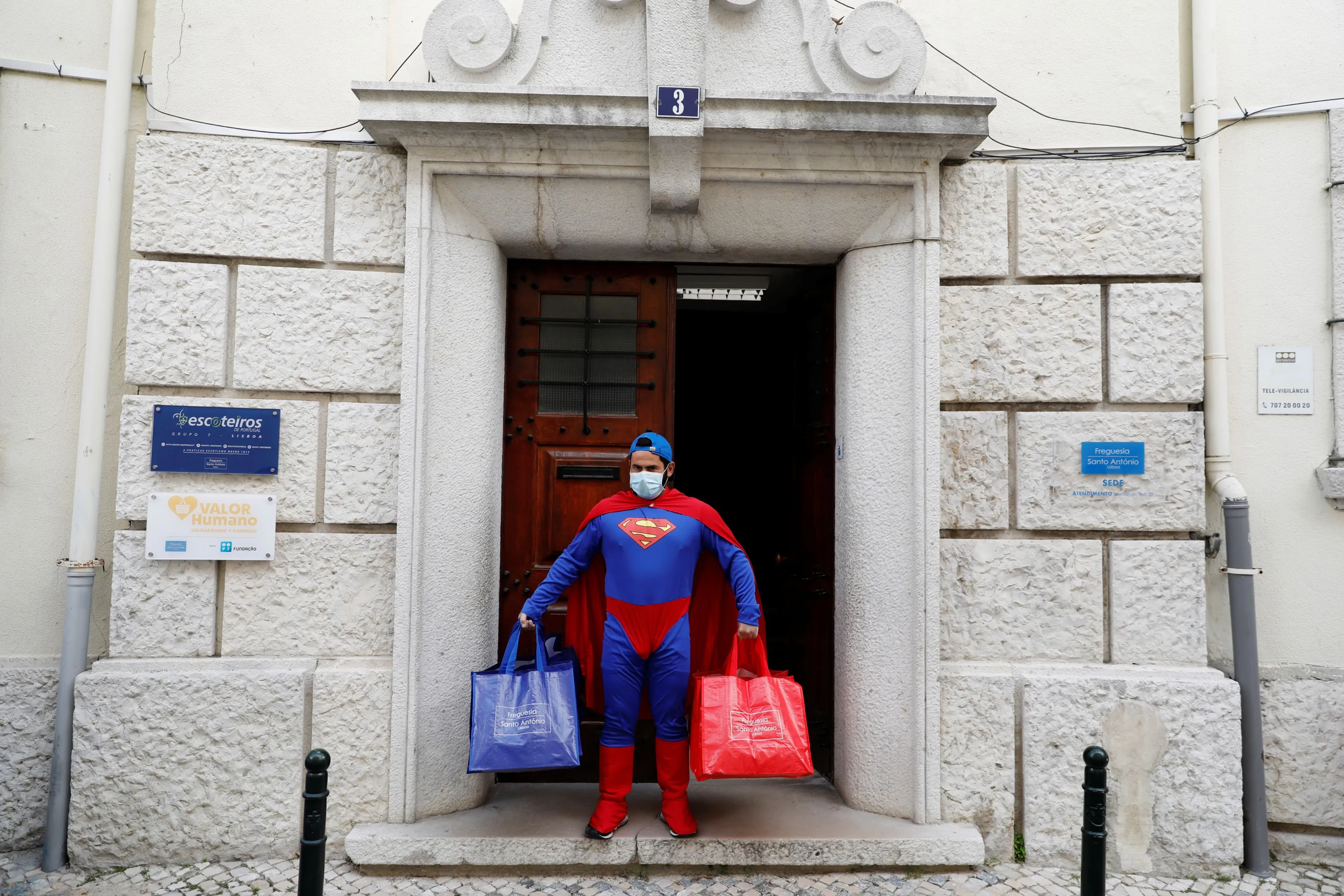 Marcos Rosa, a worker at the Santo Antonio parish council, performs while dressed up as Superman during a special tribute to municipal workers for keeping the city running as the spread of the coronavirus disease (COVID-19) continues, in Lisbon, Portugal on April 25, 2020. (Photo by Rafael Marchante/Reuters)