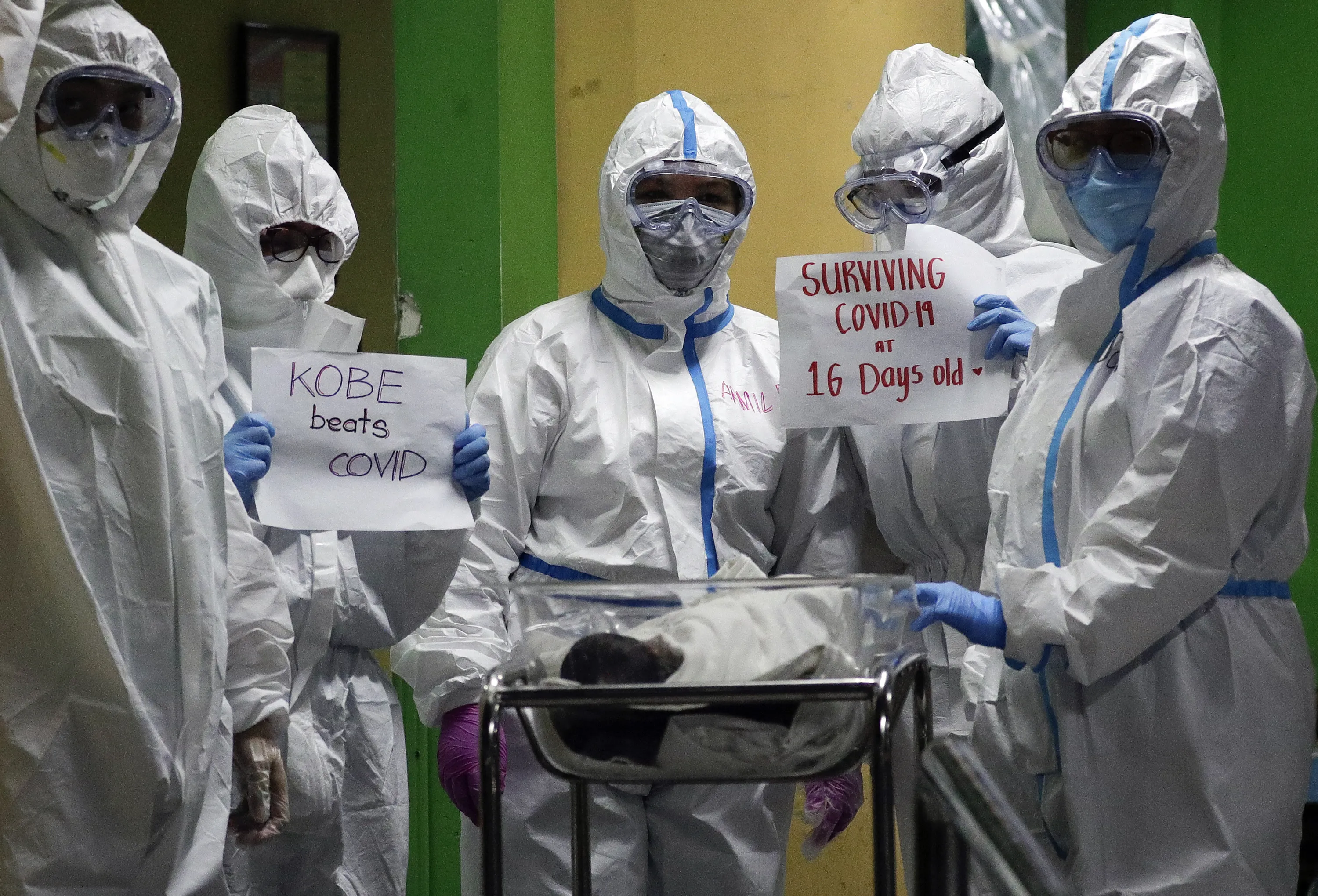Health workers wearing protective suits holds signs beside a 16-day-old baby who recovered from COVID-19 as he is discharged from the National Children's Hospital in Quezon city, Metro Manila, Philippines during a continuing enhanced community quarantine to prevent the spread of the new coronavirus on Tuesday, April 28, 2020. The baby nicknamed “Kobe” is the first COVID-19 patient to be discharged at the children's hospital. (Photo by Aaron Favila/AP Photo)