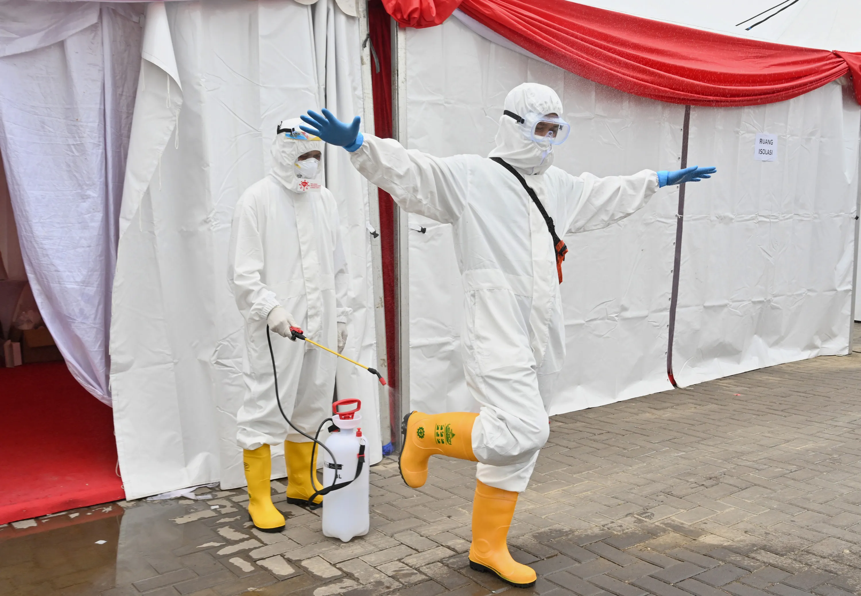 A volunteer sprays disinfectant on a doctor after conducting rapid tests for the COVID-19 coronavirus in the Kemayoran area in Jakarta on April 28, 2020. (Photo by Adek Berry/AFP Photo)