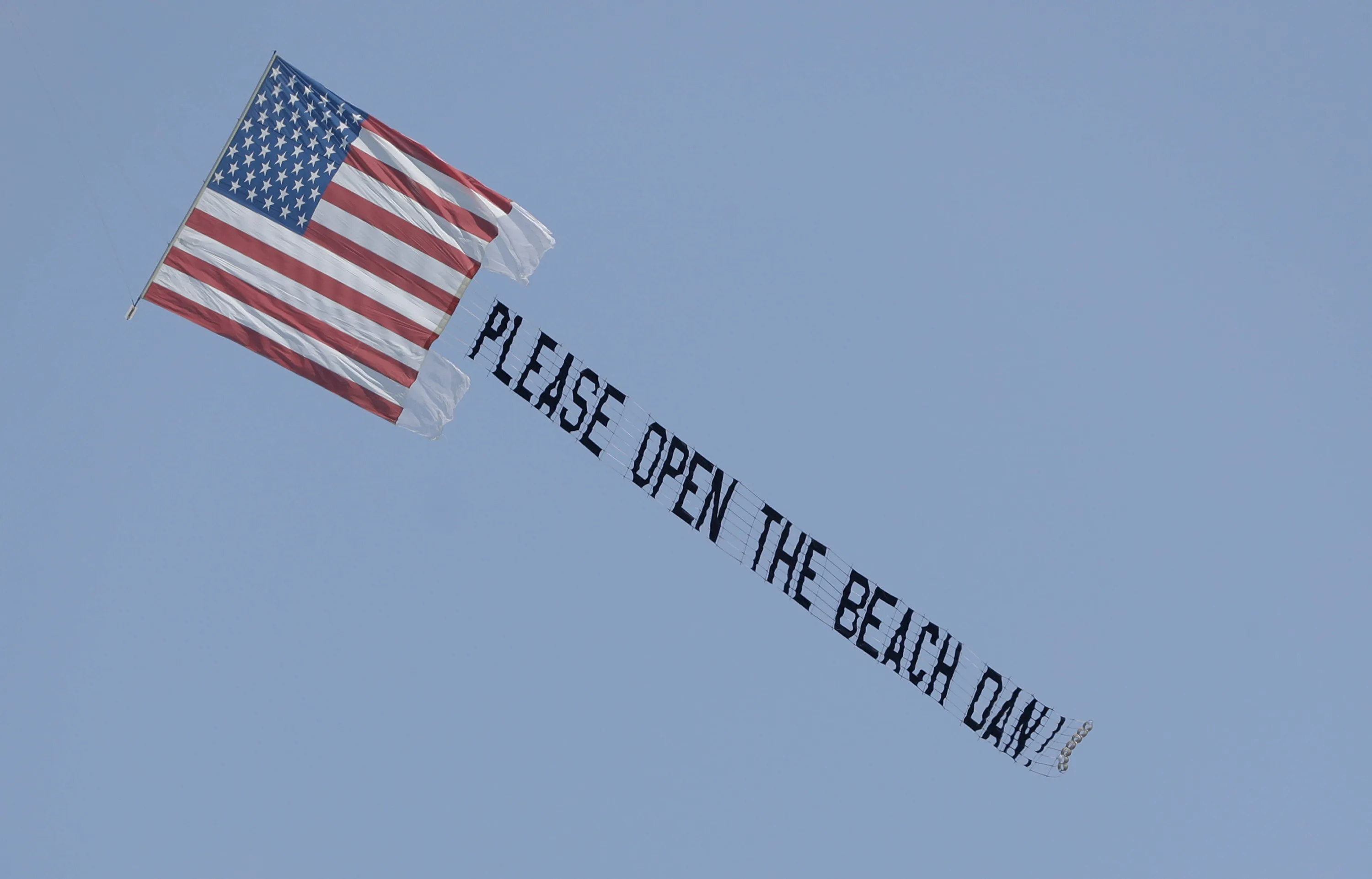 A banner plane flies a sign urging Miami Beach, Fla., Mayor Dan Gelber to open the beaches, which have been closed due to the coronavirus outbreak, Sunday, April 19, 2020, in Miami Beach, Fla. (Photo by Wilfredo Lee/AP Photo)