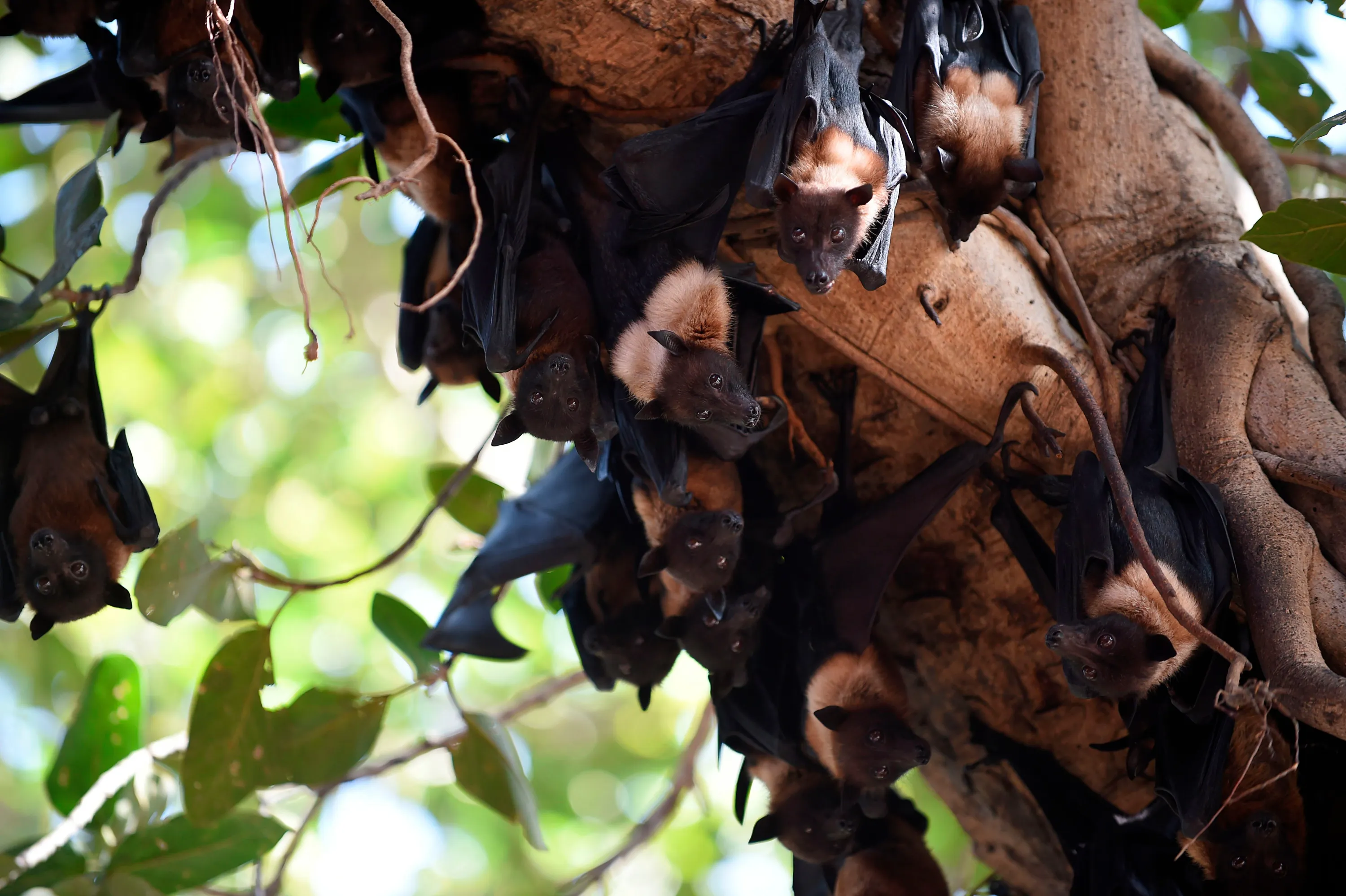 Bats cling onto the lower limbs of a Banyan tree due higt temperatures, on the campus of Gujarat College in Ahmedabad on April 28, 2020. (Photo by Sam Panthaky/AFP Photo)