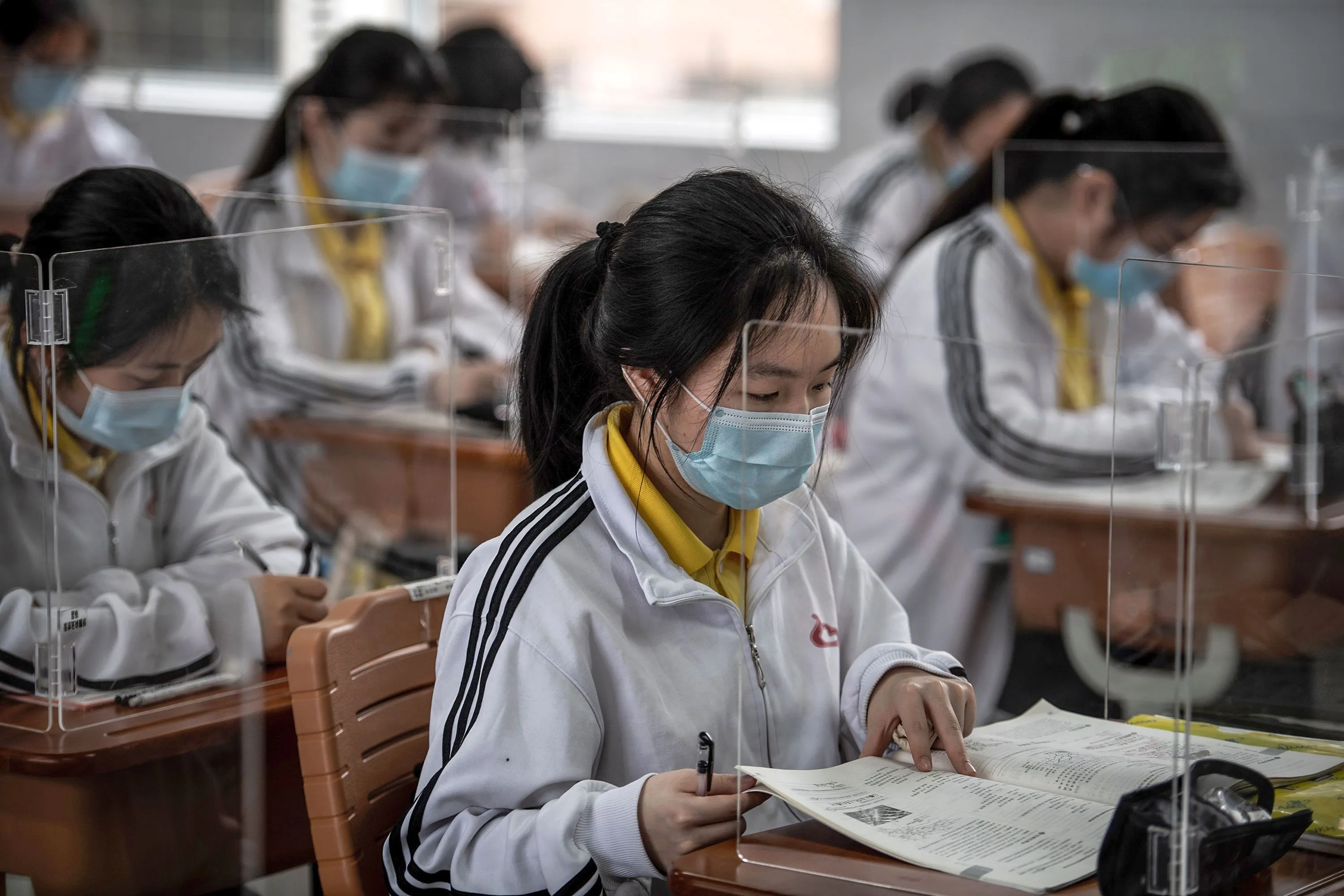 High school senior students study with plastic partitions in a classroom in Wuhan in China's central Hubei province on May 6, 2020. Senior school students in 121 institutions were back in front of chalk boards and digital displays for the first time on May 6 since their city – the ground zero of the coronavirus pandemic – shut down in January. (Photo by AFP Photo/China Stringer Network)