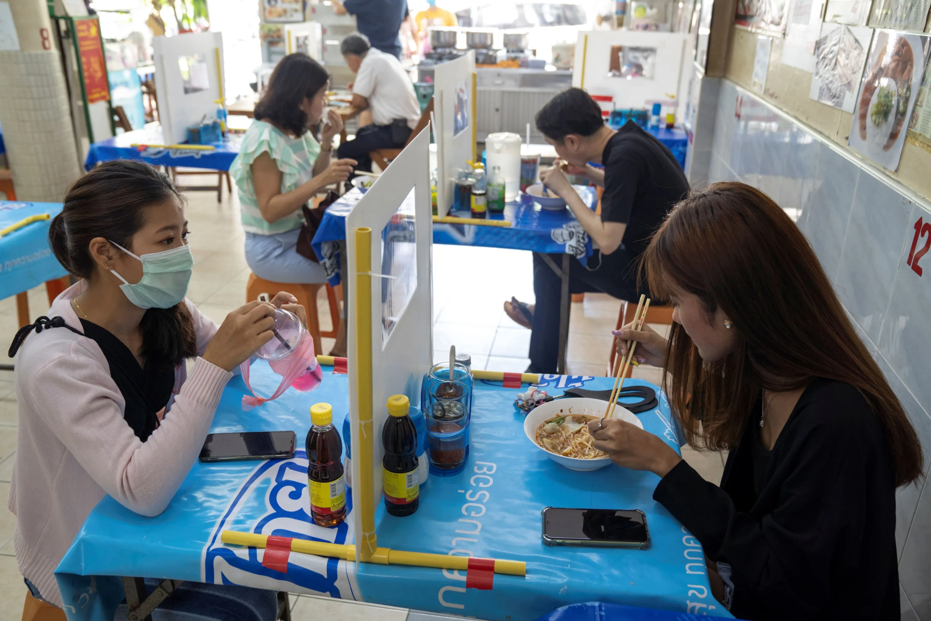 People have lunch in a noodle restaurant that reopened after the easing of restrictions with the implementation of a plastic barrier and social distancing measures to prevent the spread of the coronavirus disease (COVID-19) in Bangkok, Thailand, May 6, 2020. (Photo by Athit Perawongmetha/Reuters)