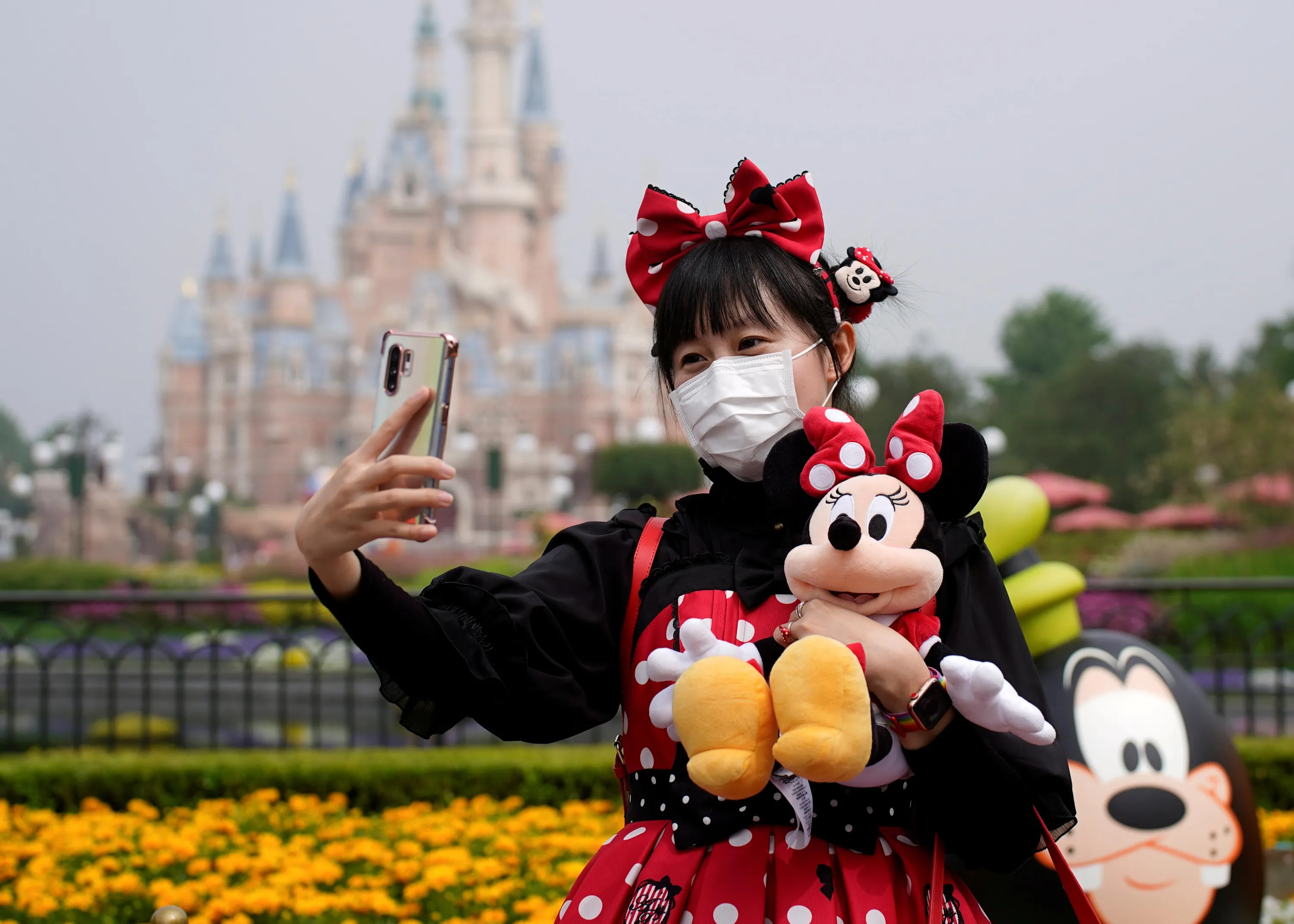 A visitor dressed as a Disney character takes a selfie while wearing a protective face mask at Shanghai Disney Resort as the Shanghai Disneyland theme park reopens following a shutdown due to the coronavirus disease (COVID-19) outbreak, in Shanghai, China on May 11, 2020. (Photo by Aly Song/Reuters)
