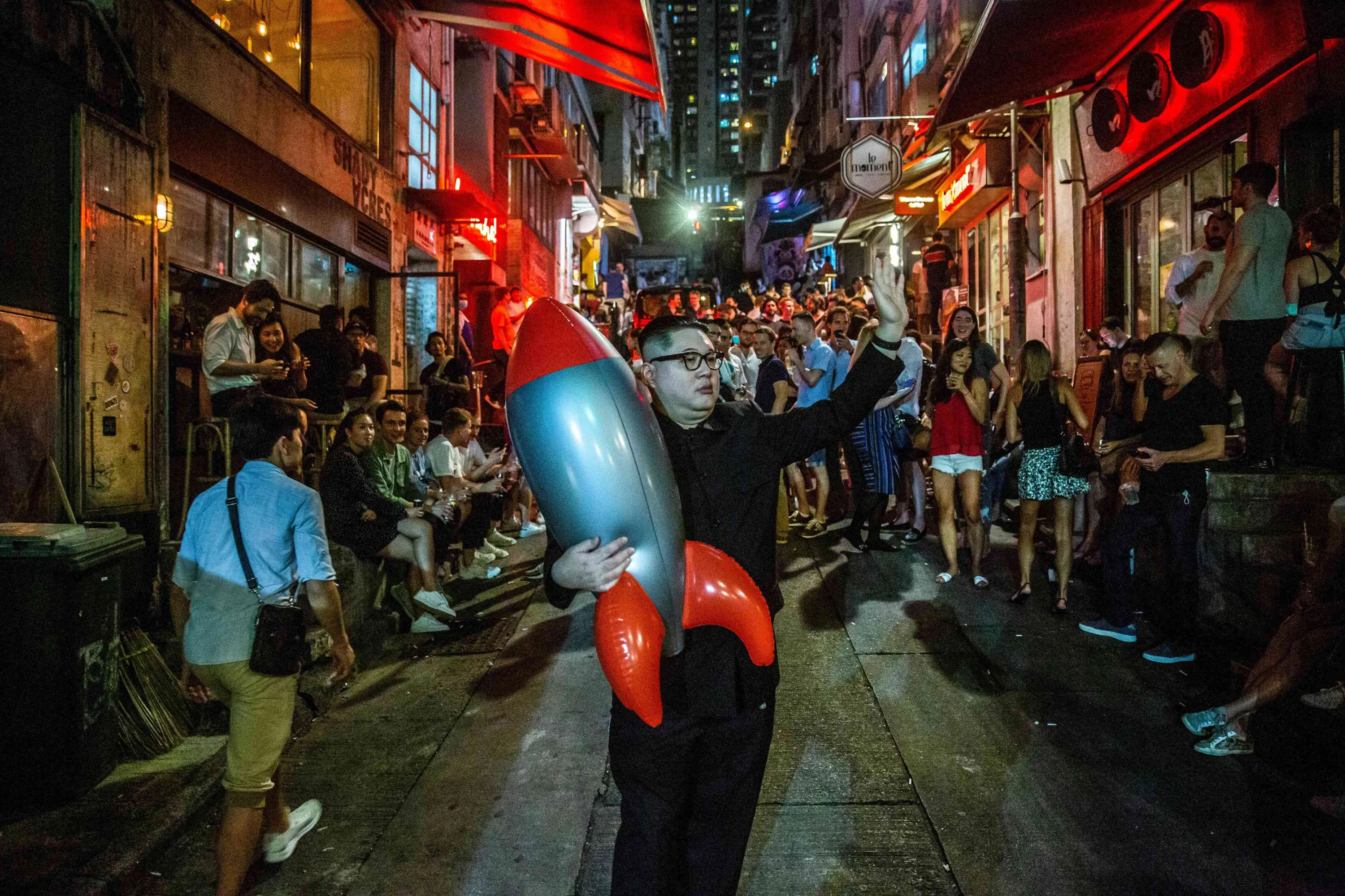 A Kim Jong-Un (C) impersonator jokes with people drinking at bars in Hong Kong on May 9, 2020. Hong Kong eased social distancing laws on May 8 which allowed some businesses to open up including bars, cinemas and gyms with certain conditions. (Photo by Isaac Lawrence/AFP Photo)