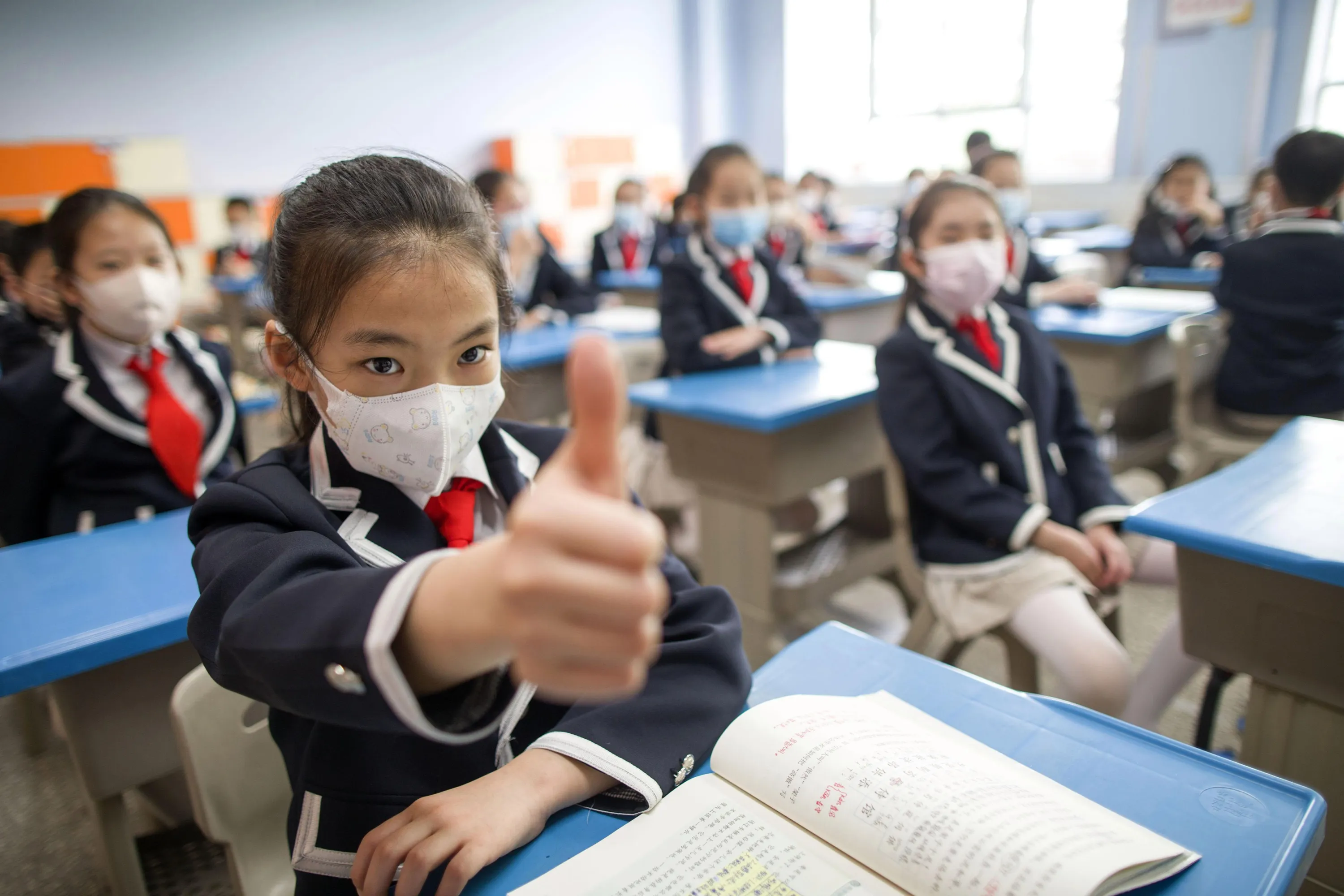 Students wearing face masks attend an epidemic prevention and control drill at Xinjianlu primary school in preparation for its reopening on May 18, 2020 in Taiyuan, Shanxi Province of China. (Photo by Zhang Yun/China News Service via Getty Images)