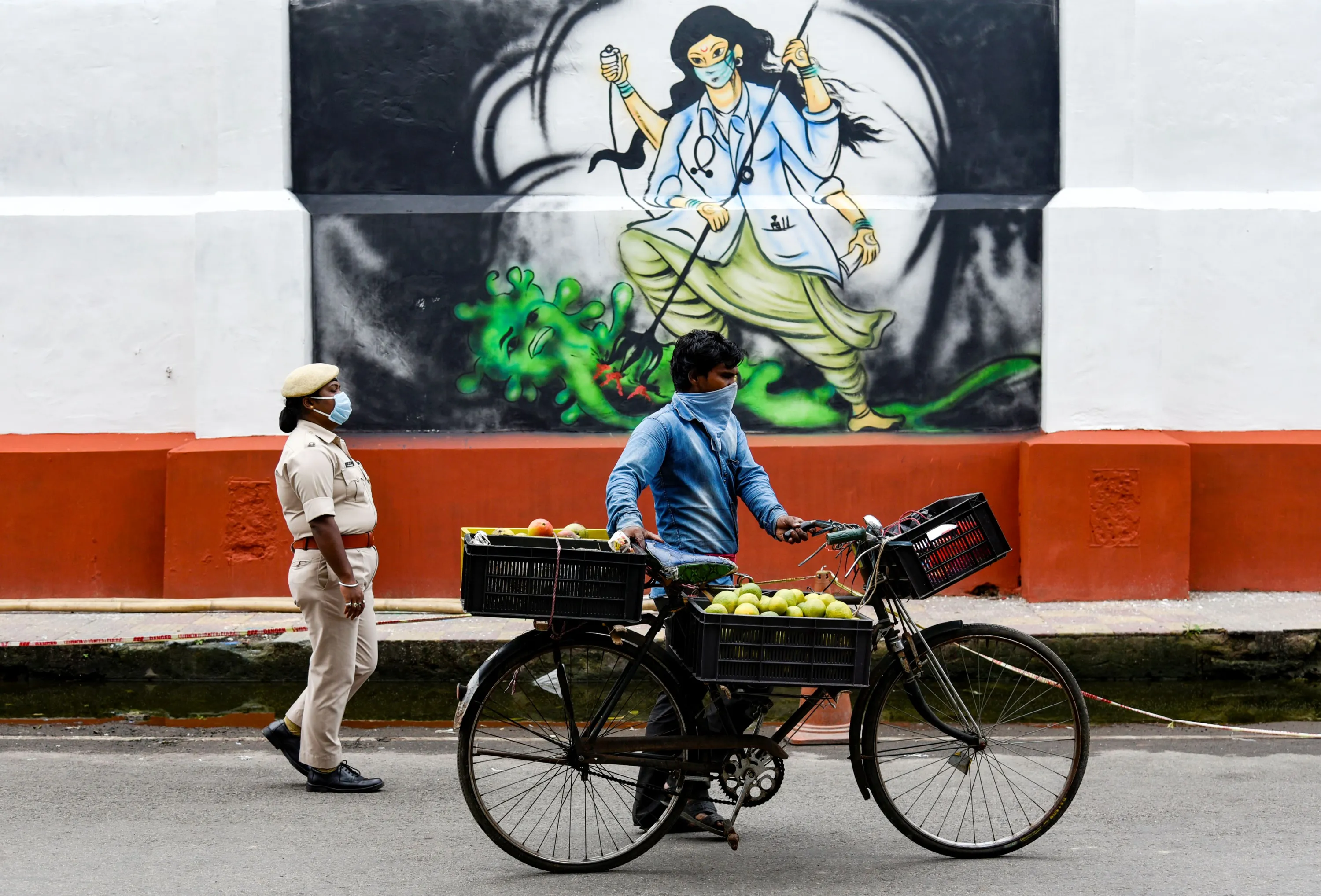 People walking past to a mural related to Coronavirus, authorities eased restrictions, during the ongoing COVID-19 nationwide lockdown, in Guwahati, Assam, India on Wednesday, 06 May 2020. (Photo by David Talukdar/NurPhoto via Getty Images)