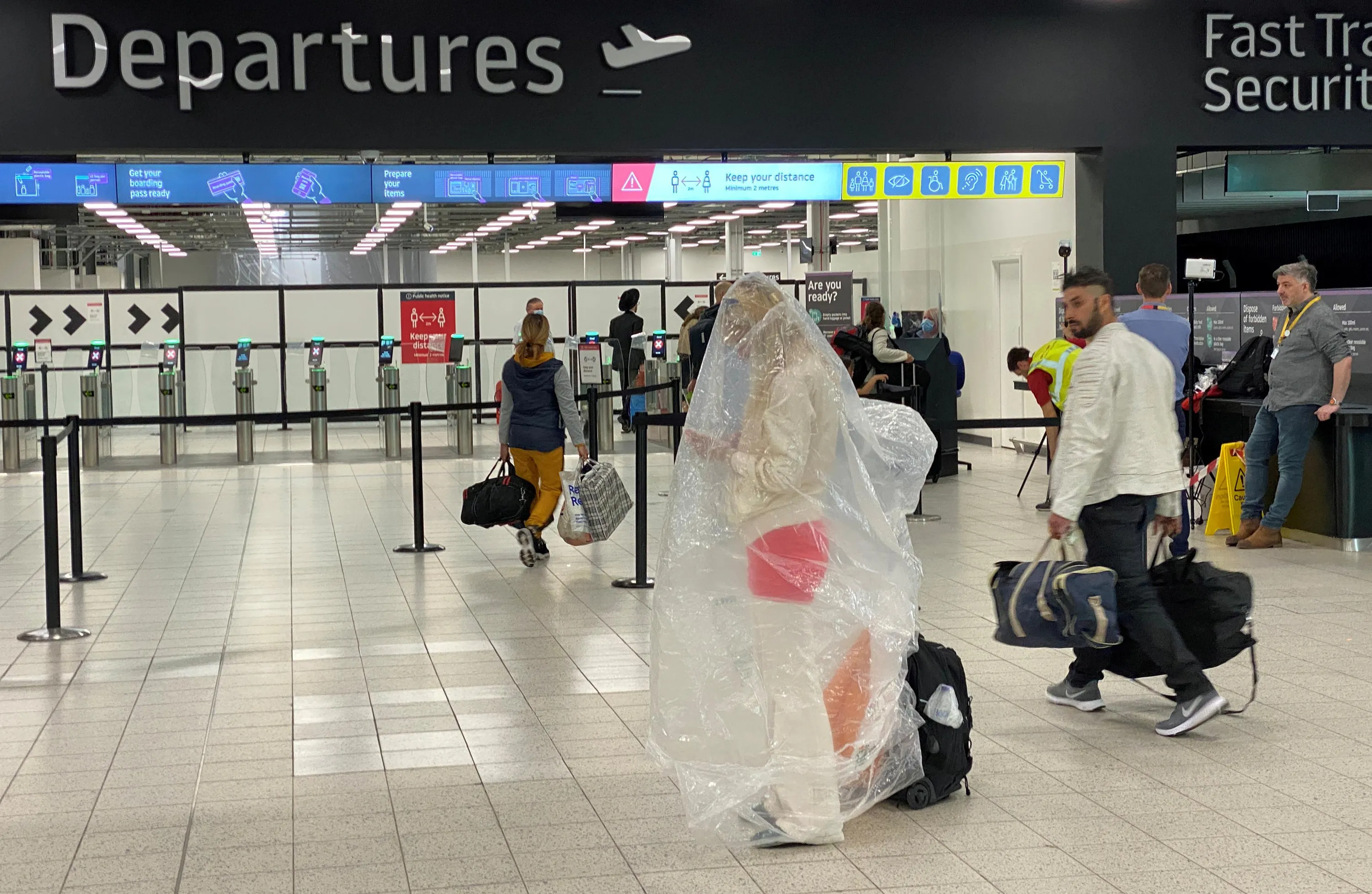 A passenger covered with a plastic bag is seen at Luton Airport, following the outbreak of the coronavirus disease (COVID-19), Luton, Britain, June 4, 2020. (Photo by Paul Childs/Reuters)