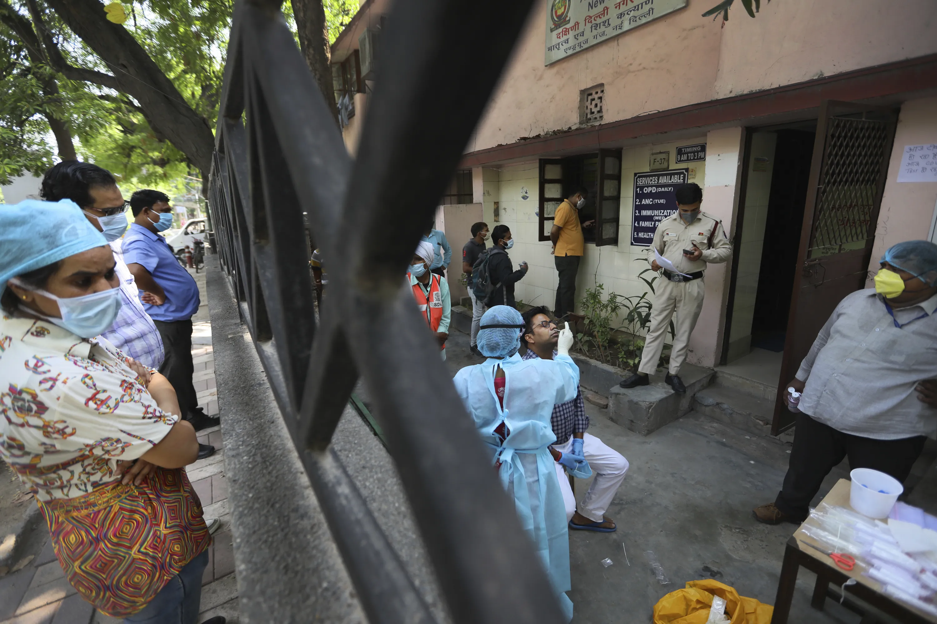 In this Wednesday, June 10, 2020 photo, people look on as health workers take swab test for COVID 19 in New Delhi, India. Two and a half months of nationwide lockdown kept numbers of infections relatively low in India. But with restrictions easing in recent weeks, cases have shot up, raising questions about whether authorities have done enough to avert catastrophe. Half of Delhi’s 8,200 hospital beds dedicated to COVID-19 patients are already full and officials are projecting more than half a million cases in the city alone by July 31. (Photo by Manish Swarup/AP Photo)