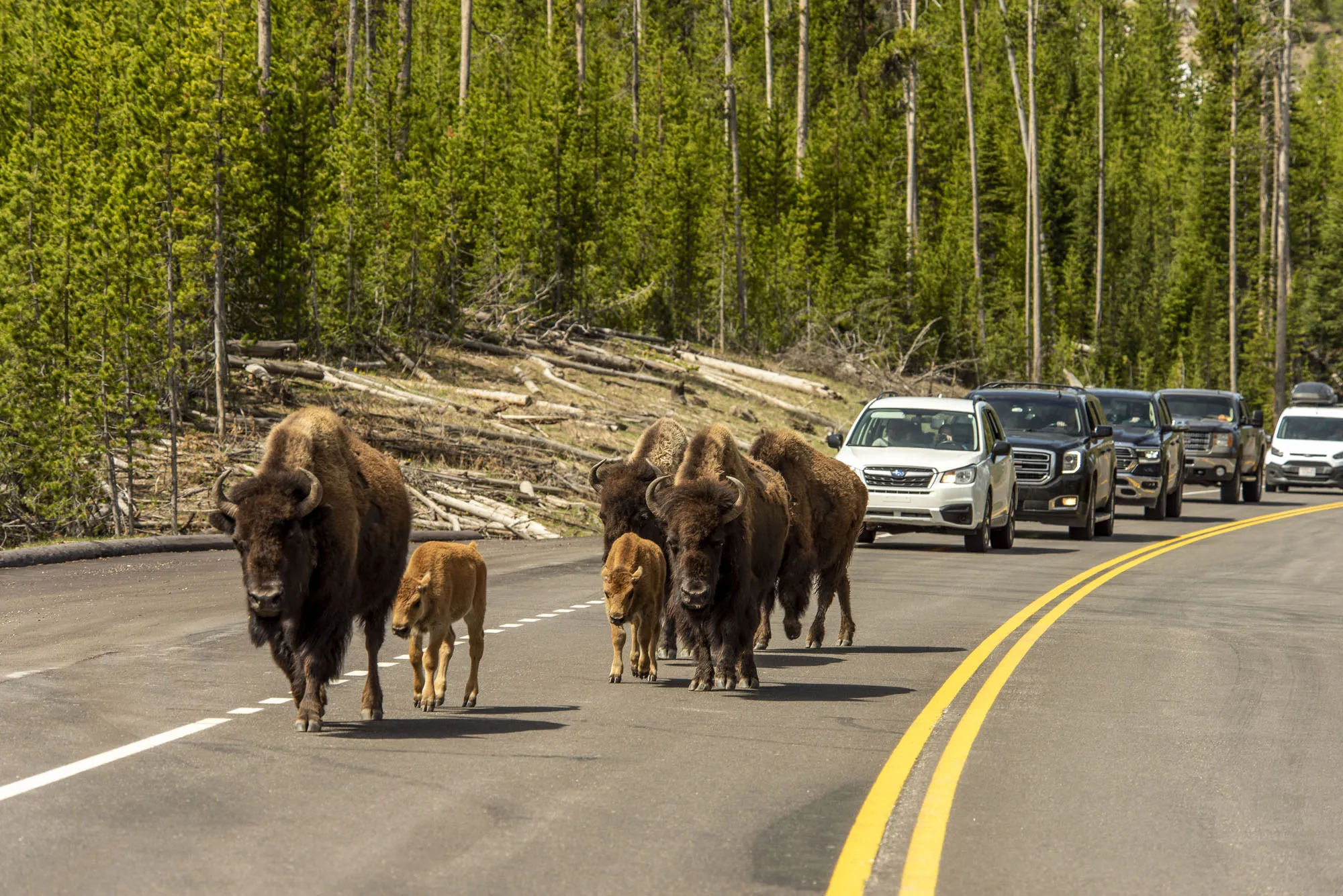 A group of cow bison and their newly born calves walk on the road as Montana gates to Yellowstone National Park opened for day trips on June 1, 2020 in Yellowstone National Park, Wyoming. The park's Montana entrances opened as the state enters phase 2 of lifting lockdown measures imposed due to the COVID-19 pandemic. (Photo by William Campbell/Getty Images)