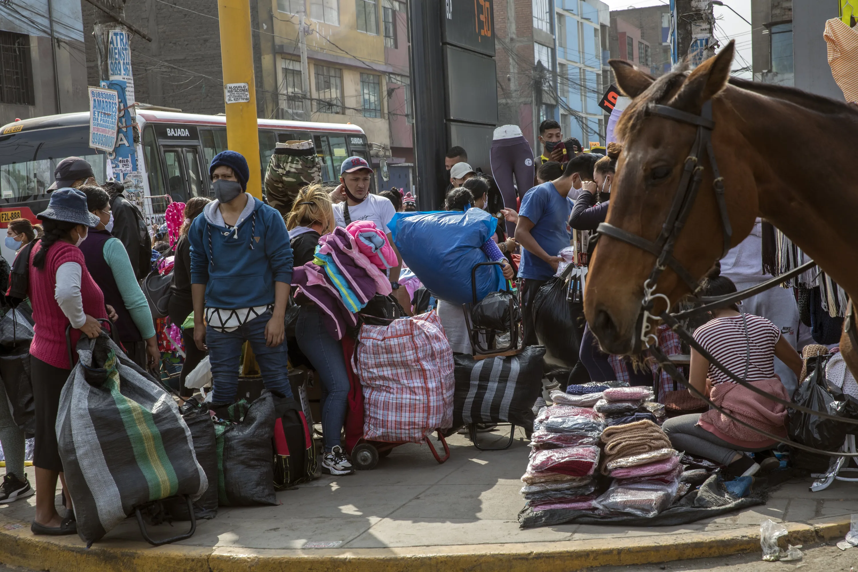 Street vendors who came out to sell their products, ignoring lockdown measures to curb the spread of the new coronavirus, wait for clients as mounted policemen patrol in La Victoria district of Lima, Peru, Friday, June 19, 2020. (Photo by Rodrigo Abd/AP Photo)