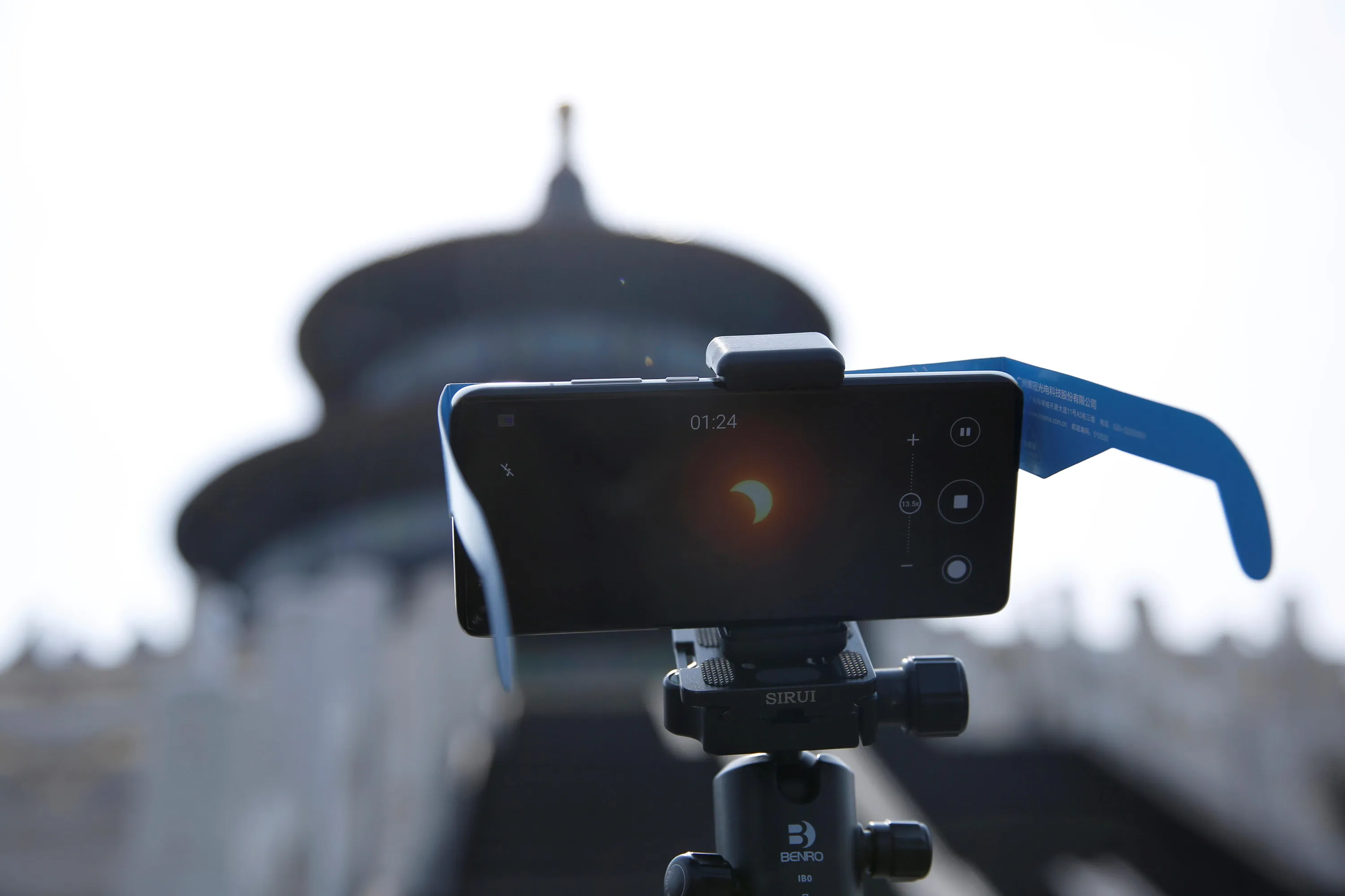 A partial solar eclipse is seen on a smartphone's screen at the Temple of Heaven park in Beijing, China June 21, 2020. (Photo by Tingshu Wang/Reuters)